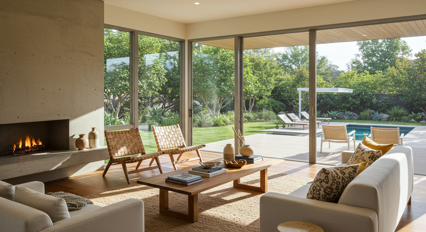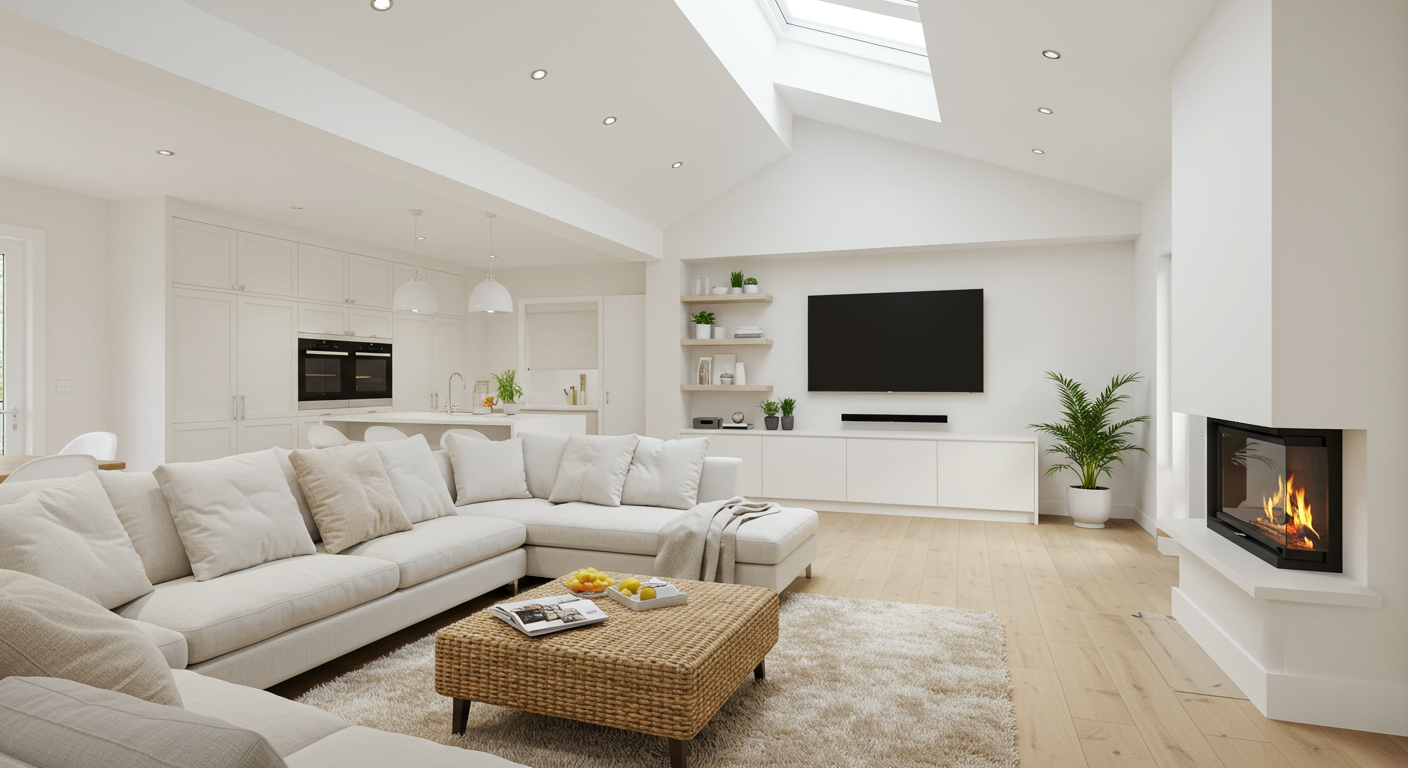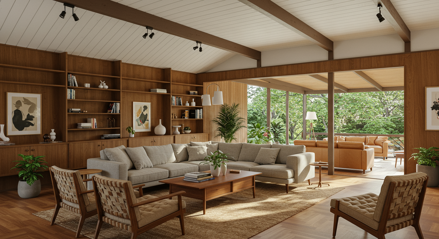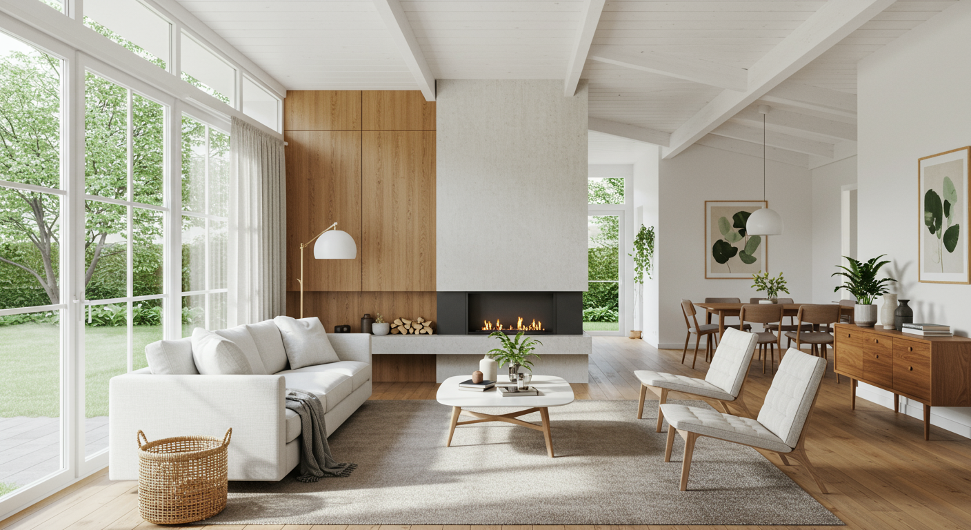 Warm wood paneling and floor to ceiling plaster of Paris finished fireplace accent the living room