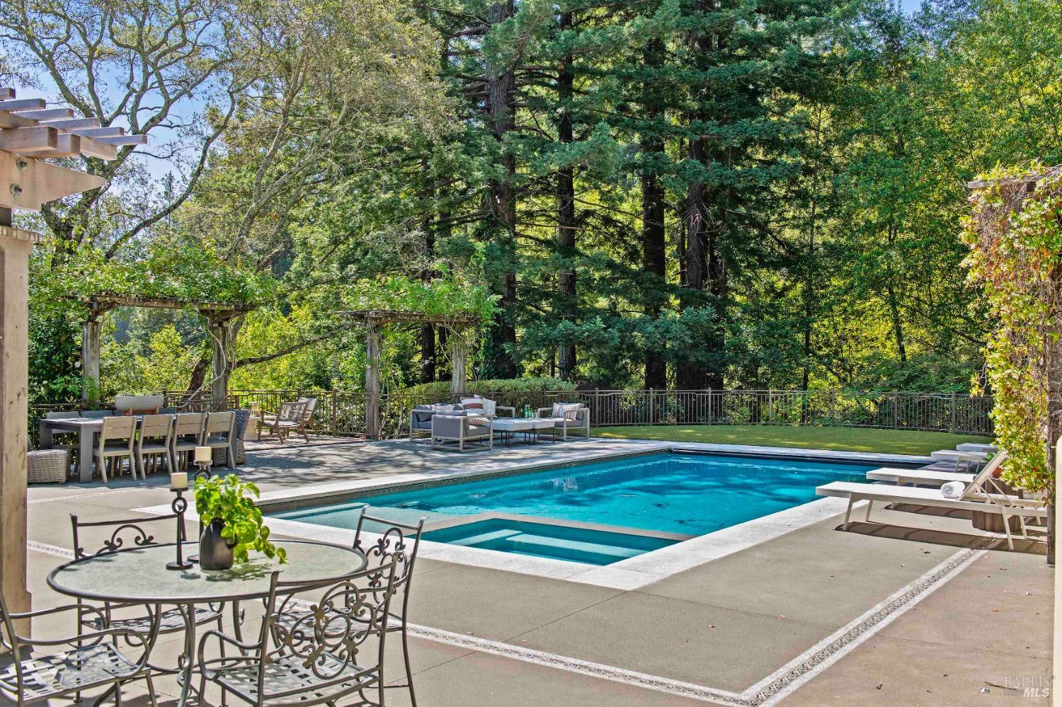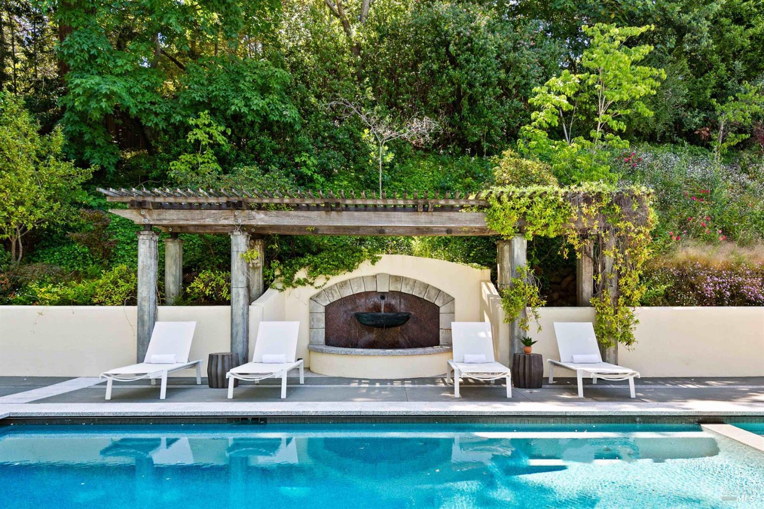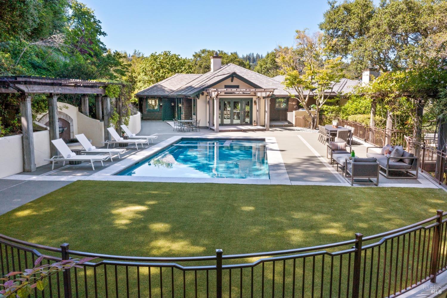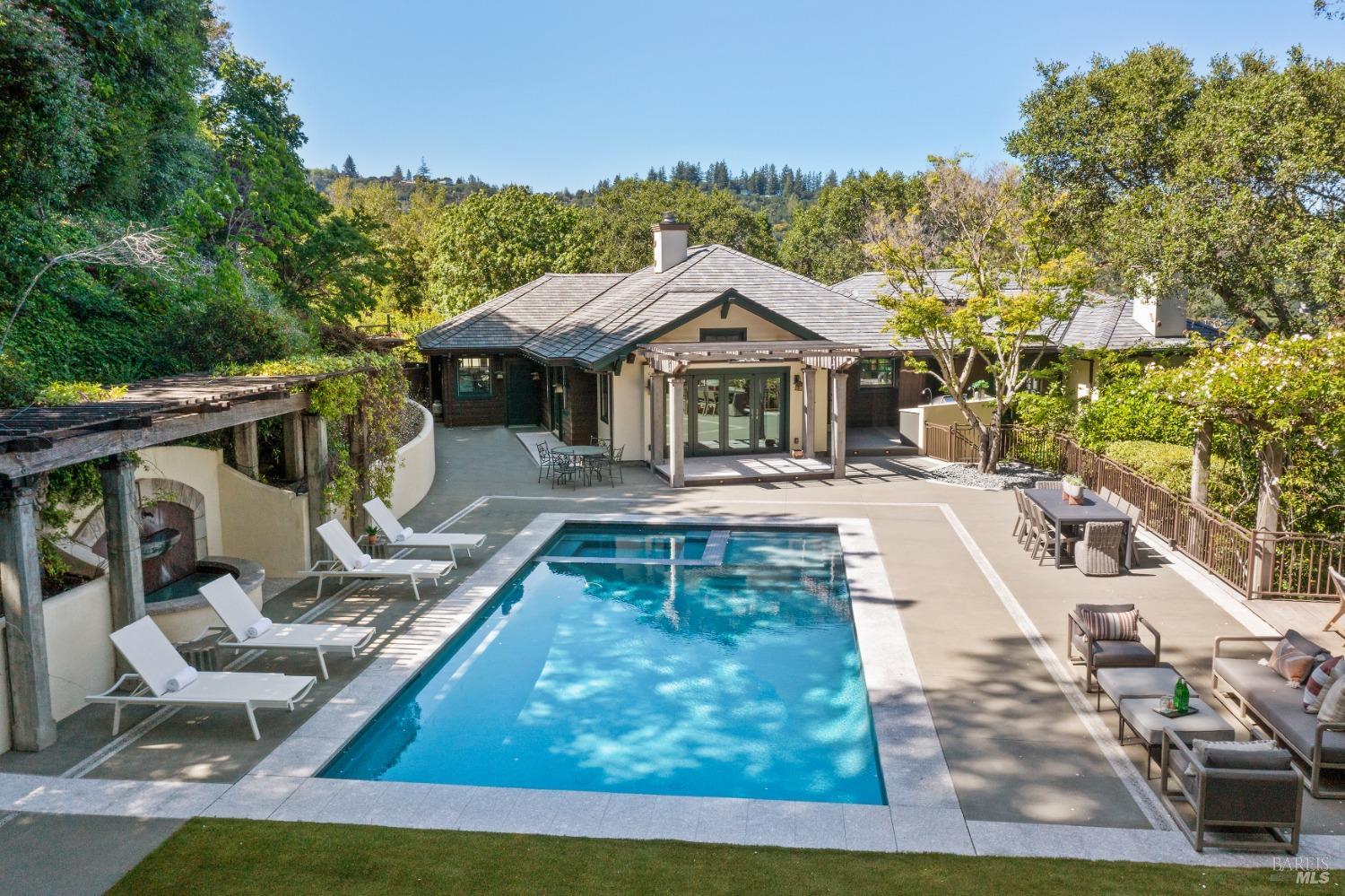 This custom-built home by Rempe Construction, renowned for superior quality and attention to detail, is an exquisite example of refined elegance. A grand, formal foyer with high ceilings and beautiful crown moldings welcomes you. Large-scale rooms and elegant finishes, including crown moldings, wainscoting, and custom-built cabinetry, reflect artistry in every corner. 150-year-old Chestnut floors convey a sense of rich history and enduring beauty, adding warmth and character throughout the main living areas. The kitchen, bright and recently updated with quartz counters and a large central island, opens directly to a dramatic great room with vaulted, exposed beam ceilings, Dolby surround sound system, and a new window wall that opens directly to the spectacular recently renovated backyard. Surrounded by lush, mature landscaping, the serene and private backyard includes a solar-heated pool with spa, a soothing fountain, and a fully outfitted outdoor kitchen. A pool pergola with outdoor heating completes the space, making it perfect for entertaining or relaxing. There are 5 spacious bedrooms (4 Ensuite), an exercise room, laundry room, whole house generator, fully fenced with driveway gate.