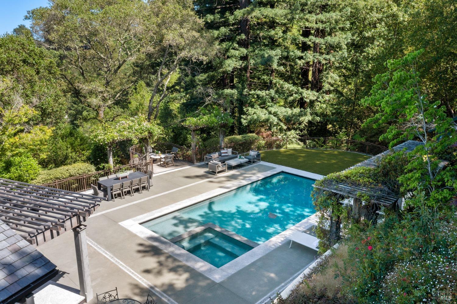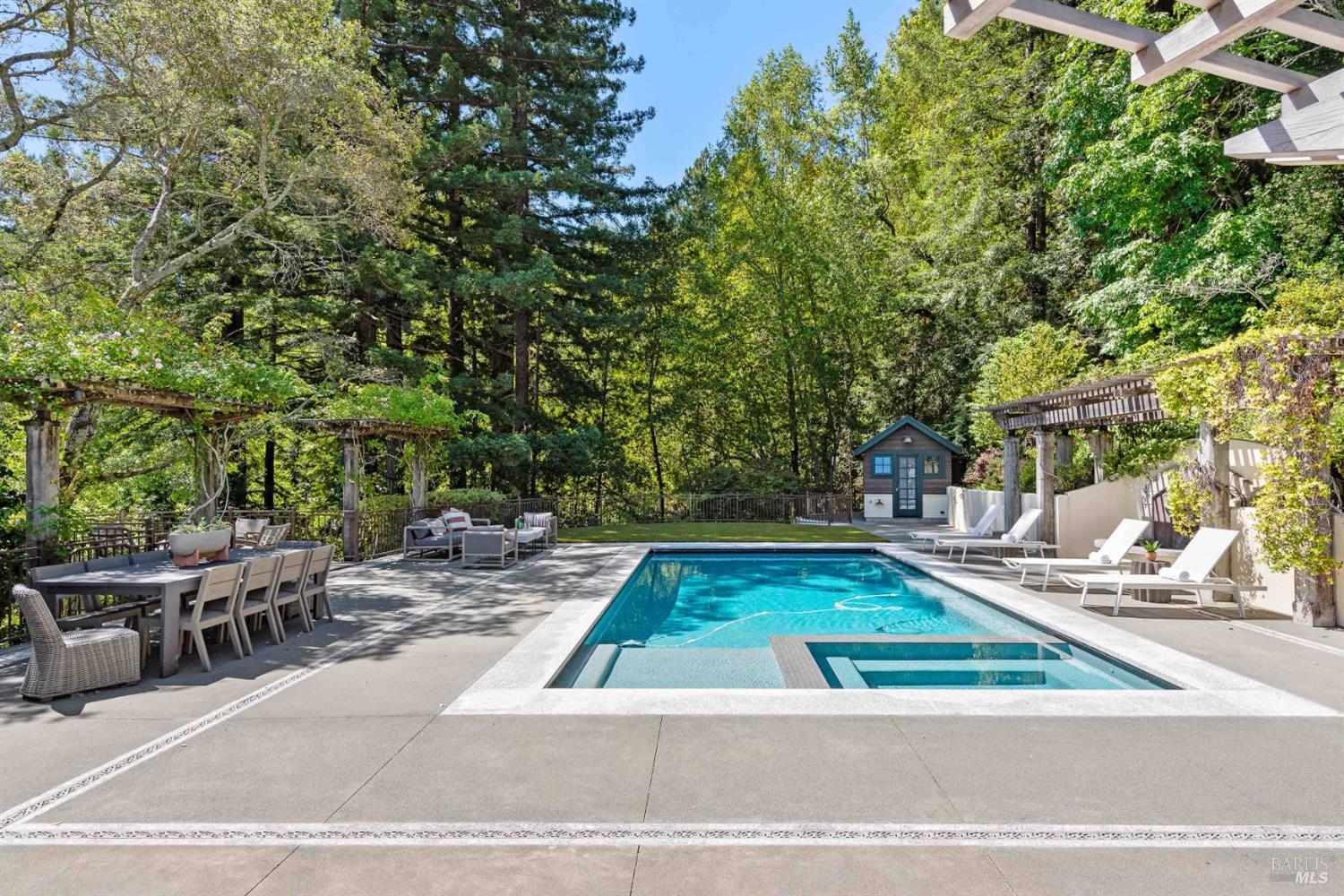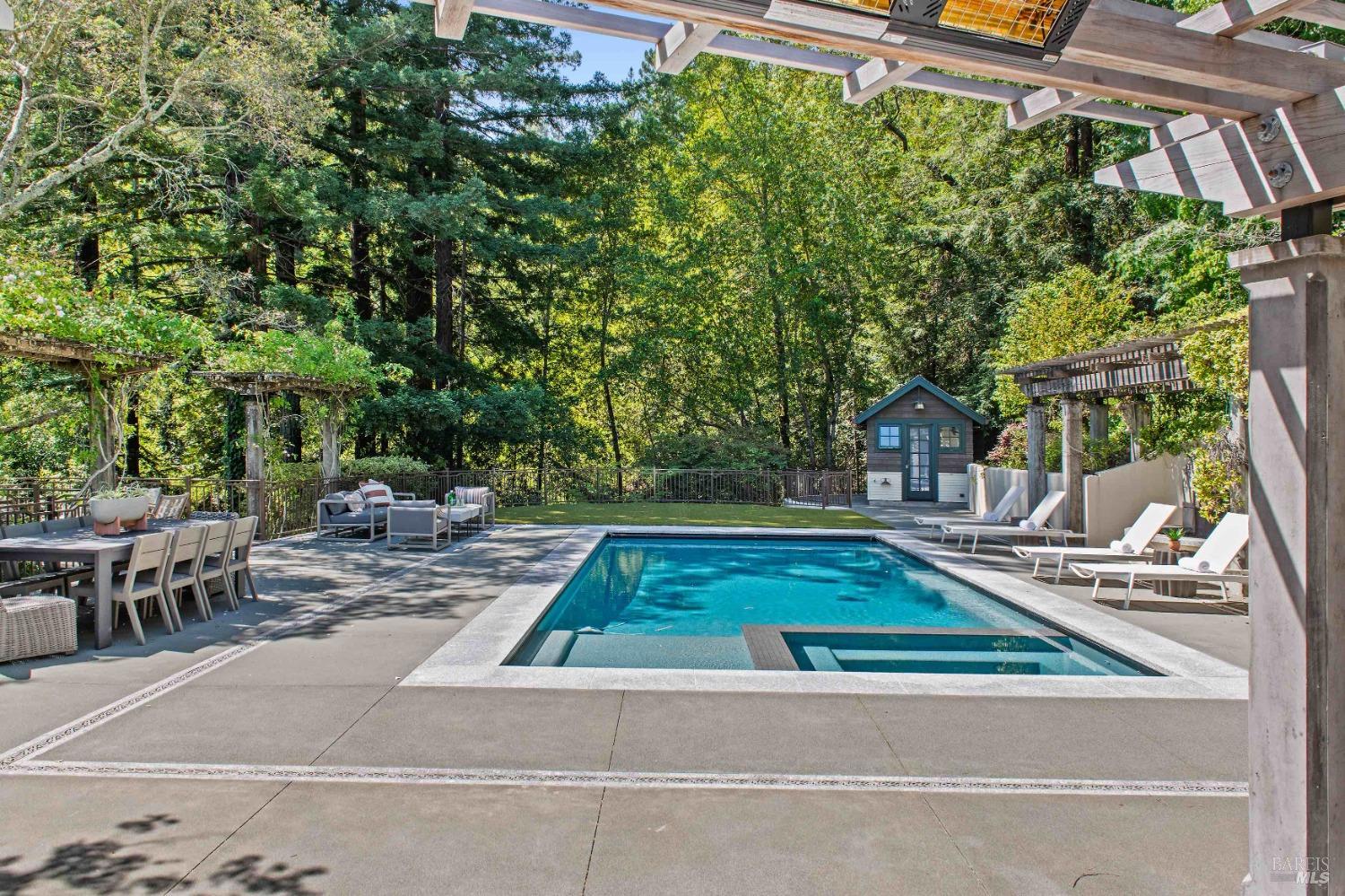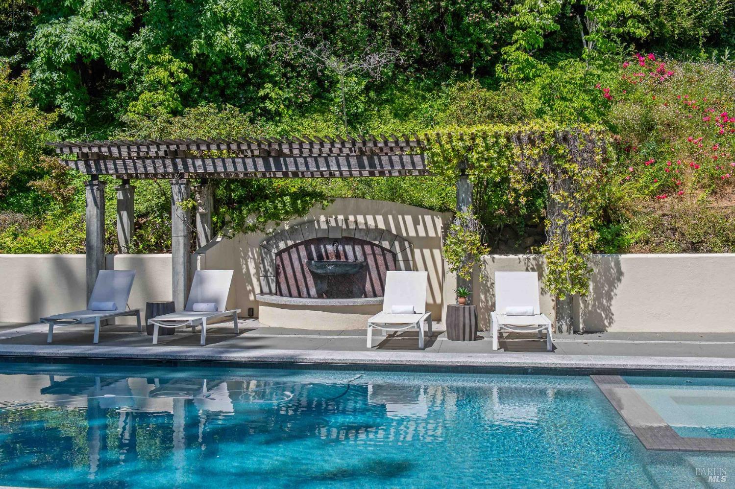 This custom-built home by Rempe Construction, renowned for superior quality and attention to detail, is an exquisite example of refined elegance. A grand, formal foyer with high ceilings and beautiful crown moldings welcomes you. Large-scale rooms and elegant finishes, including crown moldings, wainscoting, and custom-built cabinetry, reflect artistry in every corner. 150-year-old Chestnut floors convey a sense of rich history and enduring beauty, adding warmth and character throughout the main living areas. The kitchen, bright and recently updated with quartz counters and a large central island, opens directly to a dramatic great room with vaulted, exposed beam ceilings, Dolby surround sound system, and a new window wall that opens directly to the spectacular recently renovated backyard. Surrounded by lush, mature landscaping, the serene and private backyard includes a solar-heated pool with spa, a soothing fountain, and a fully outfitted outdoor kitchen. A pool pergola with outdoor heating completes the space, making it perfect for entertaining or relaxing. There are 5 spacious bedrooms (4 Ensuite), an exercise room, laundry room, whole house generator, fully fenced with driveway gate.