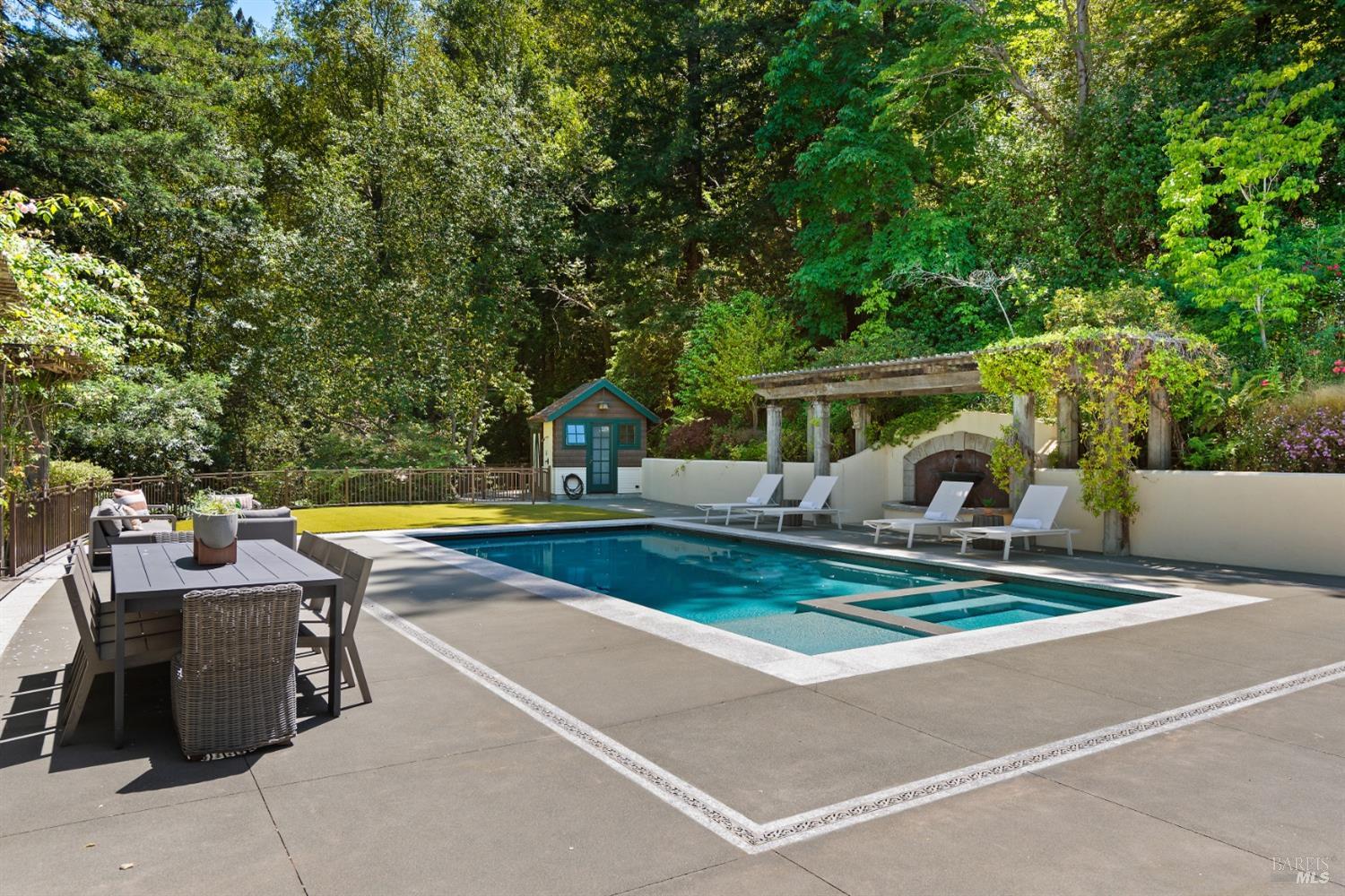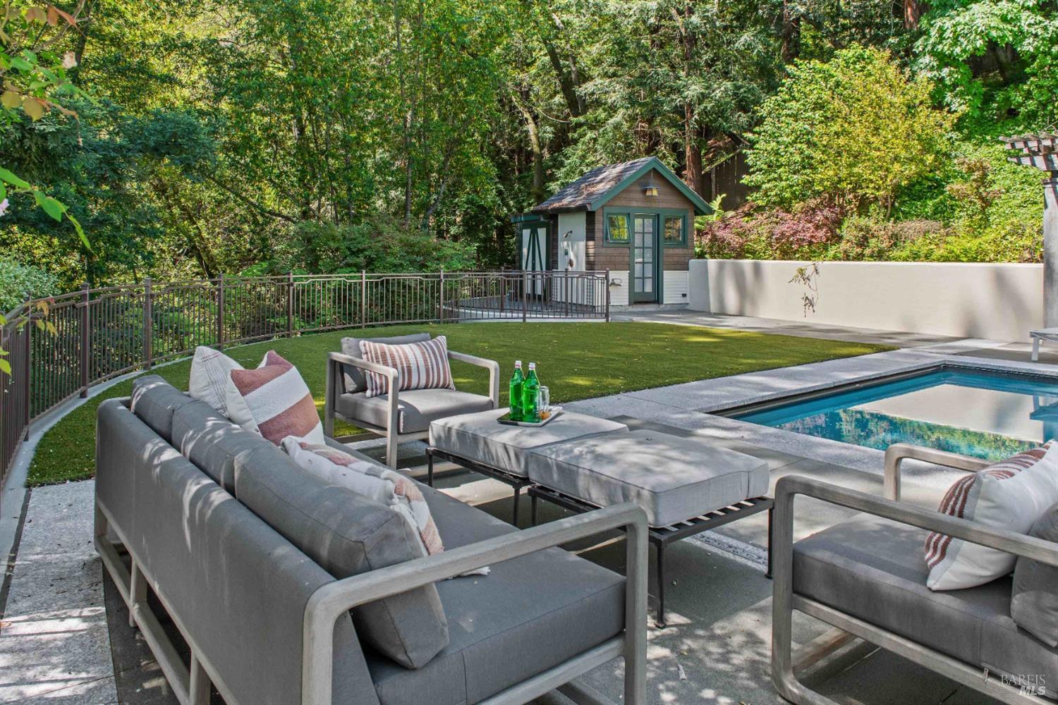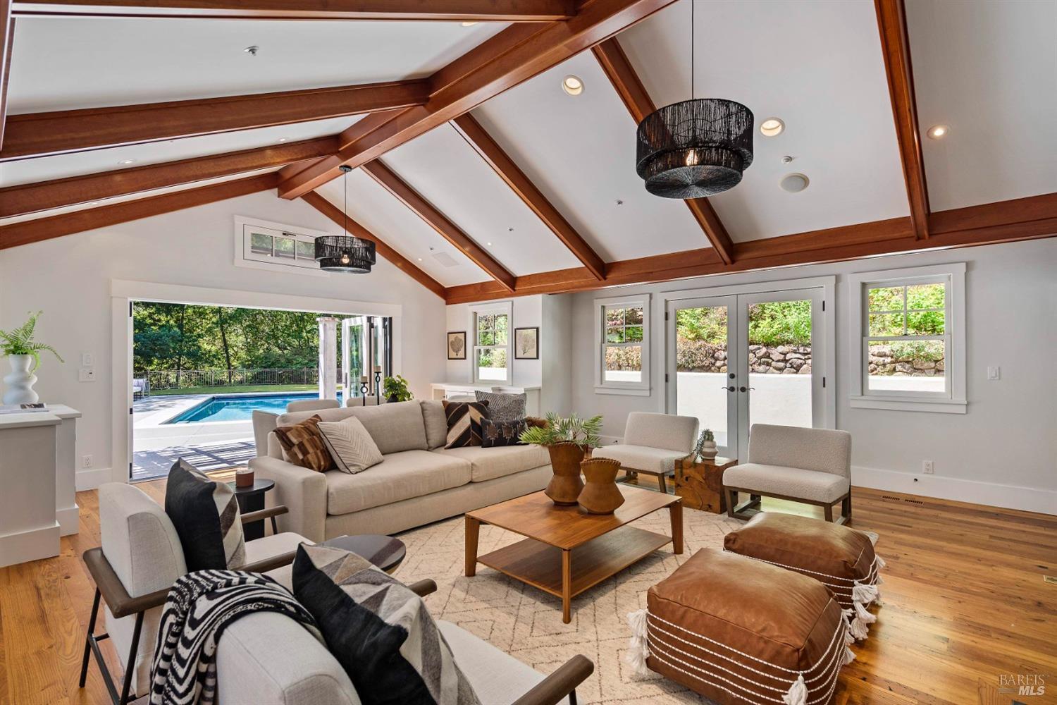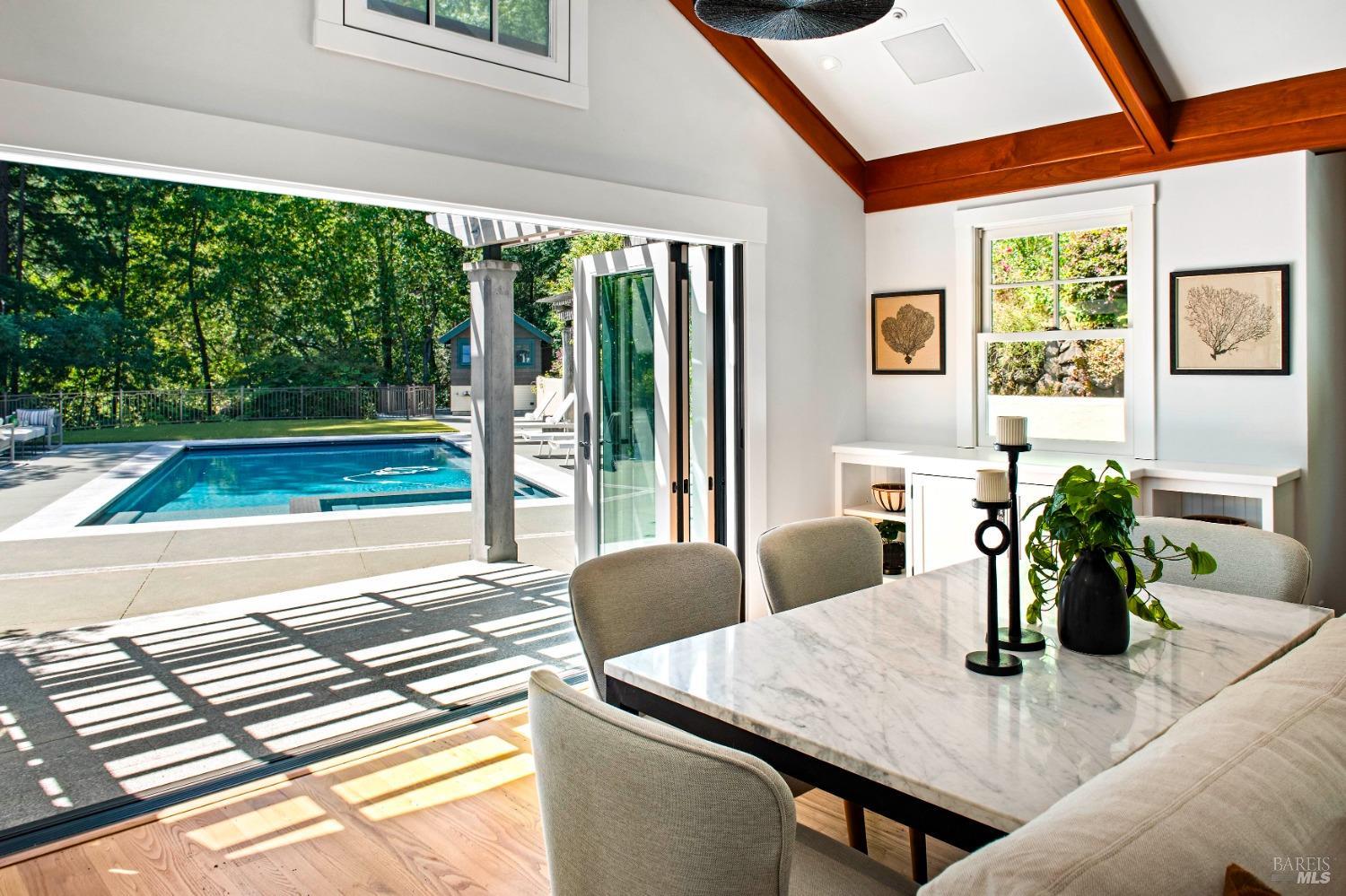 This custom-built home by Rempe Construction, renowned for superior quality and attention to detail, is an exquisite example of refined elegance. A grand, formal foyer with high ceilings and beautiful crown moldings welcomes you. Large-scale rooms and elegant finishes, including crown moldings, wainscoting, and custom-built cabinetry, reflect artistry in every corner. 150-year-old Chestnut floors convey a sense of rich history and enduring beauty, adding warmth and character throughout the main living areas. The kitchen, bright and recently updated with quartz counters and a large central island, opens directly to a dramatic great room with vaulted, exposed beam ceilings, Dolby surround sound system, and a new window wall that opens directly to the spectacular recently renovated backyard. Surrounded by lush, mature landscaping, the serene and private backyard includes a solar-heated pool with spa, a soothing fountain, and a fully outfitted outdoor kitchen. A pool pergola with outdoor heating completes the space, making it perfect for entertaining or relaxing. There are 5 spacious bedrooms (4 Ensuite), an exercise room, laundry room, whole house generator, fully fenced with driveway gate.