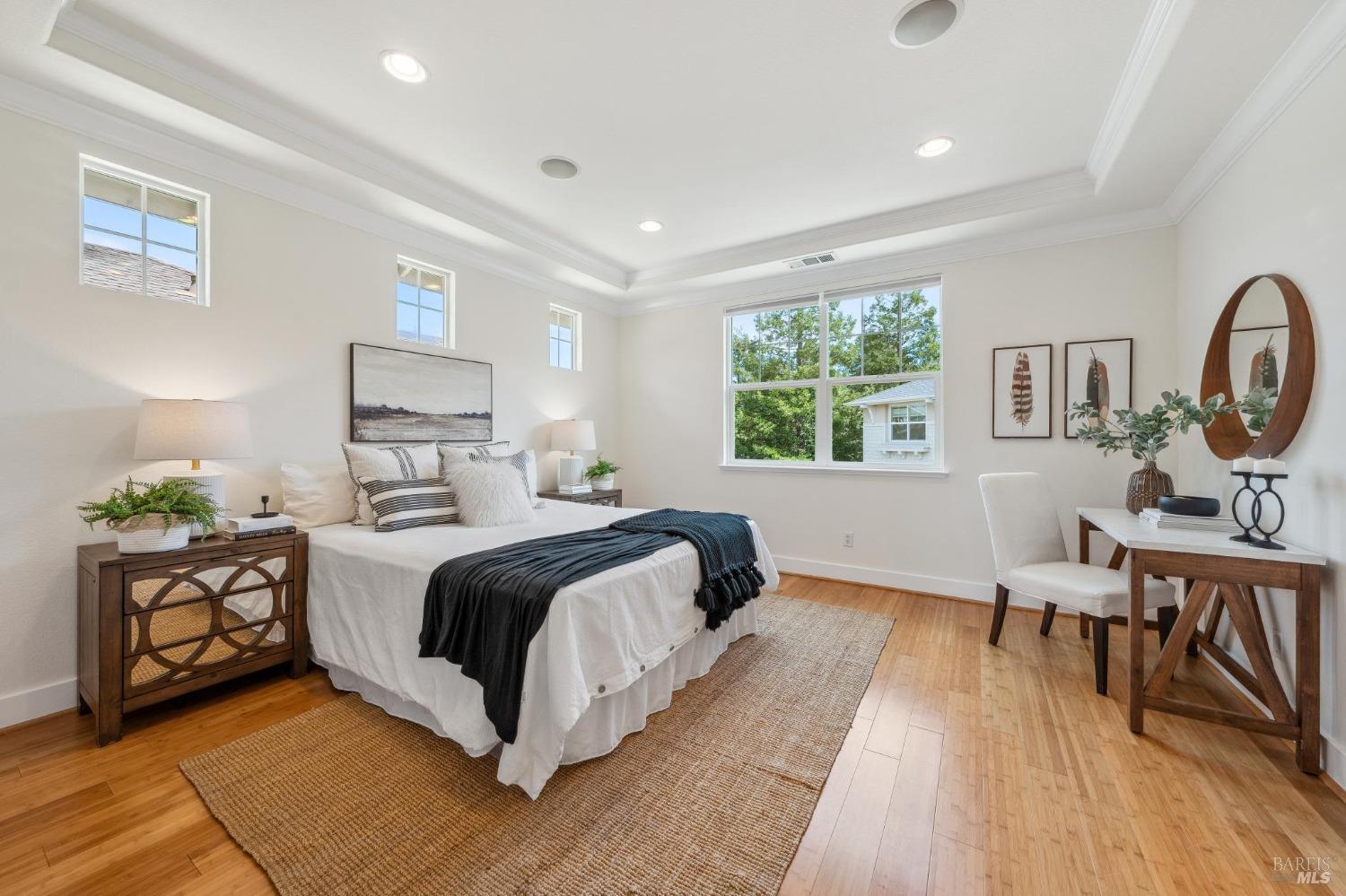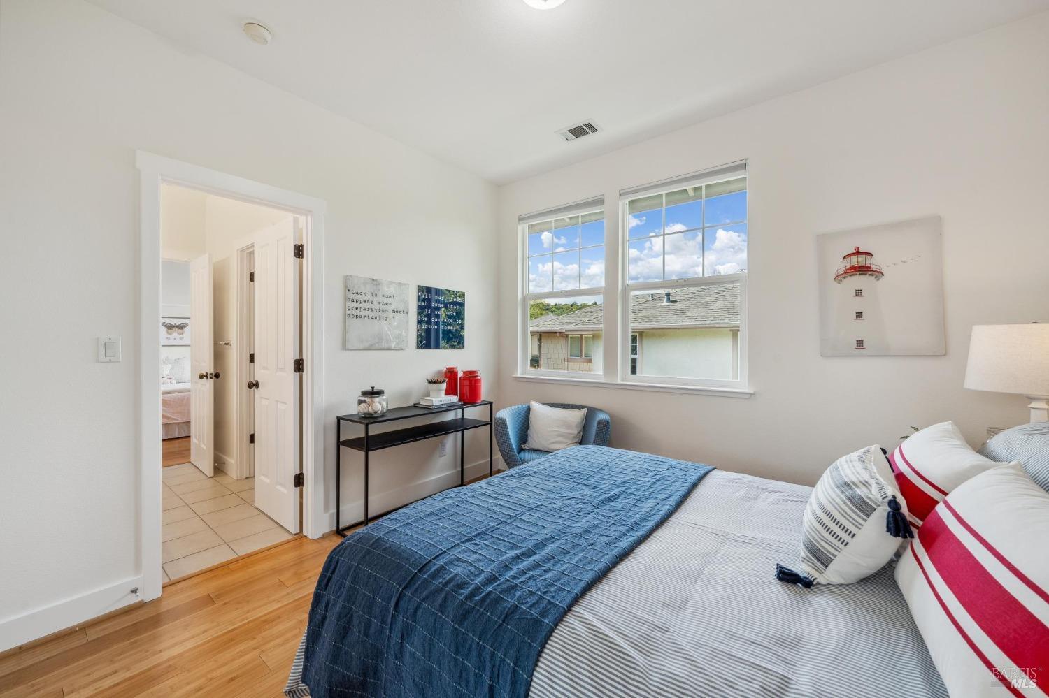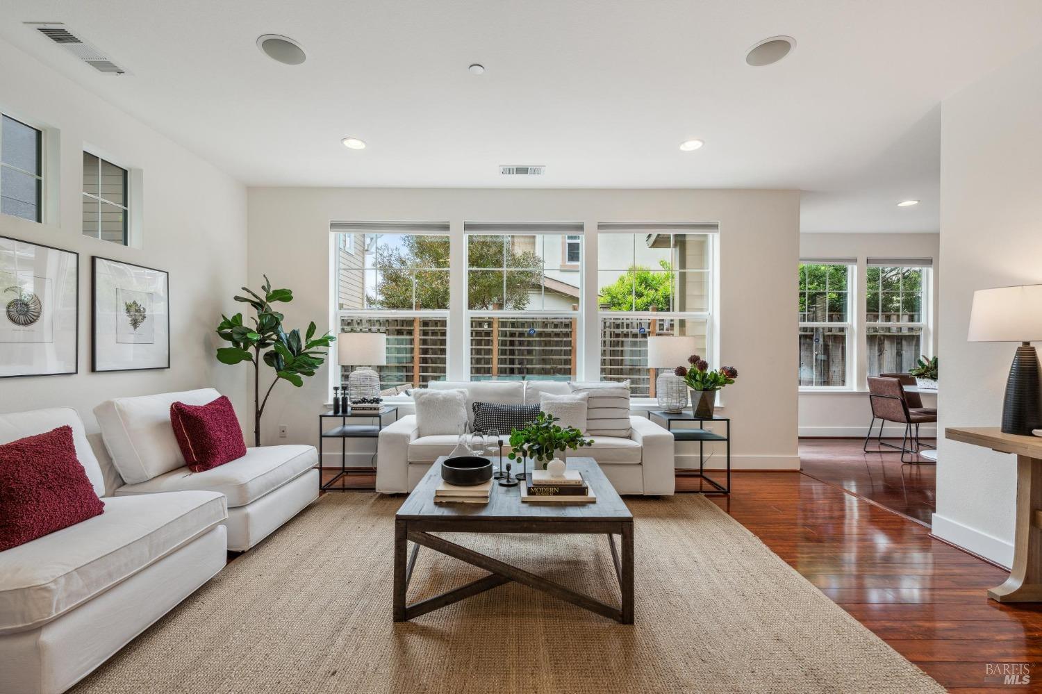 Welcome to 6 Sycamore Ct., an inviting detached home within the popular Redwood Village in San Rafael. Upon entering you will find rich cherry wood floors, high ceilings and natural light that creates a sense of openness throughout the home. The kitchen showcases granite counters and abundant cabinetry. There's an open flow to the kitchen, dining area and living room that creates a great space for entertaining or just relaxing with easy access to the rear patio. Three bedrooms and two baths upstairs with a half bath downstairs are arranged with convenience, comfort and privacy in mind. Two of the bedrooms are separated by a large shared bathroom, very convenient for family as well as guests. The primary bedroom is an ensuite. A beautiful park and playground are located just across the street. Easy access to downtown San Rafael shopping via 101 and the Civic Center public library, JCC and weekend farmer's markets are just minutes away.