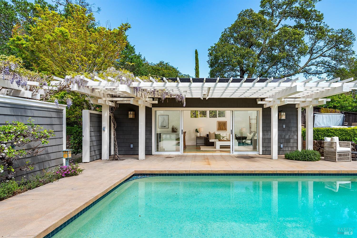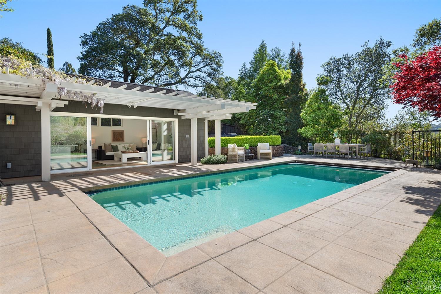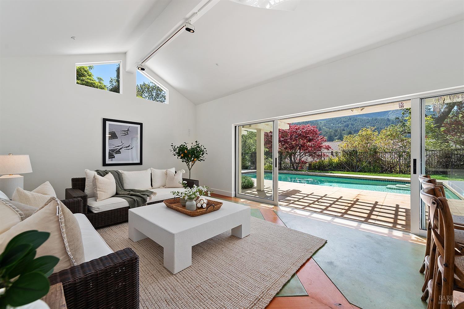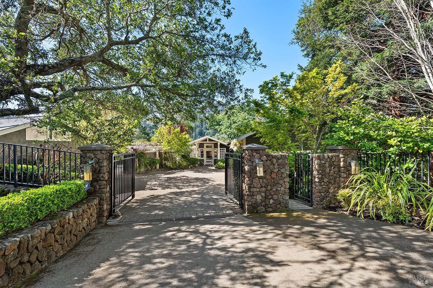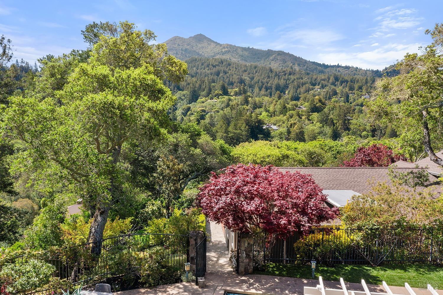 A rare and extraordinary find in lower Kent Woodlands, 8 Live Oak Way is the kind of property that almost never comes available. Set on a private, sun-drenched, 0.66 acre street-to-street lot at the end of a quiet lane, this 5,155 sq. ft. gated compound offers total seclusion, breathtaking scale, and sensational indoor-outdoor flow. The dramatic living room stuns with vaulted, exposed beam ceilings and walls of glass. The kitchen is a showpiece, with a statement island and picture window perfectly framing Mt. Tam. The Main level includes open living spaces, a sun-drenched, expansive primary with direct Mt.Tam views, an additional bedroom, a dedicated office, and laundry room. Downstairs, enjoy a rec room with two ensuite bedrooms and access to the outdoors. Two additional structures elevate the lifestyle: a 315 sq. ft. guest house with kitchenette and bath, and a 390 sq. ft. pool house featuring a full-length multi-slide glass door which opens completely to reveal stunning views of Mt. Tam and the glittering pool beyond, creating a true sanctuary of indoor-outdoor living. Additionally there's a hot tub, level lawn, lush gardens, motor court, EV charging, and A/C. A true Kent Woodlands retreat; private, polished, and unforgettable.