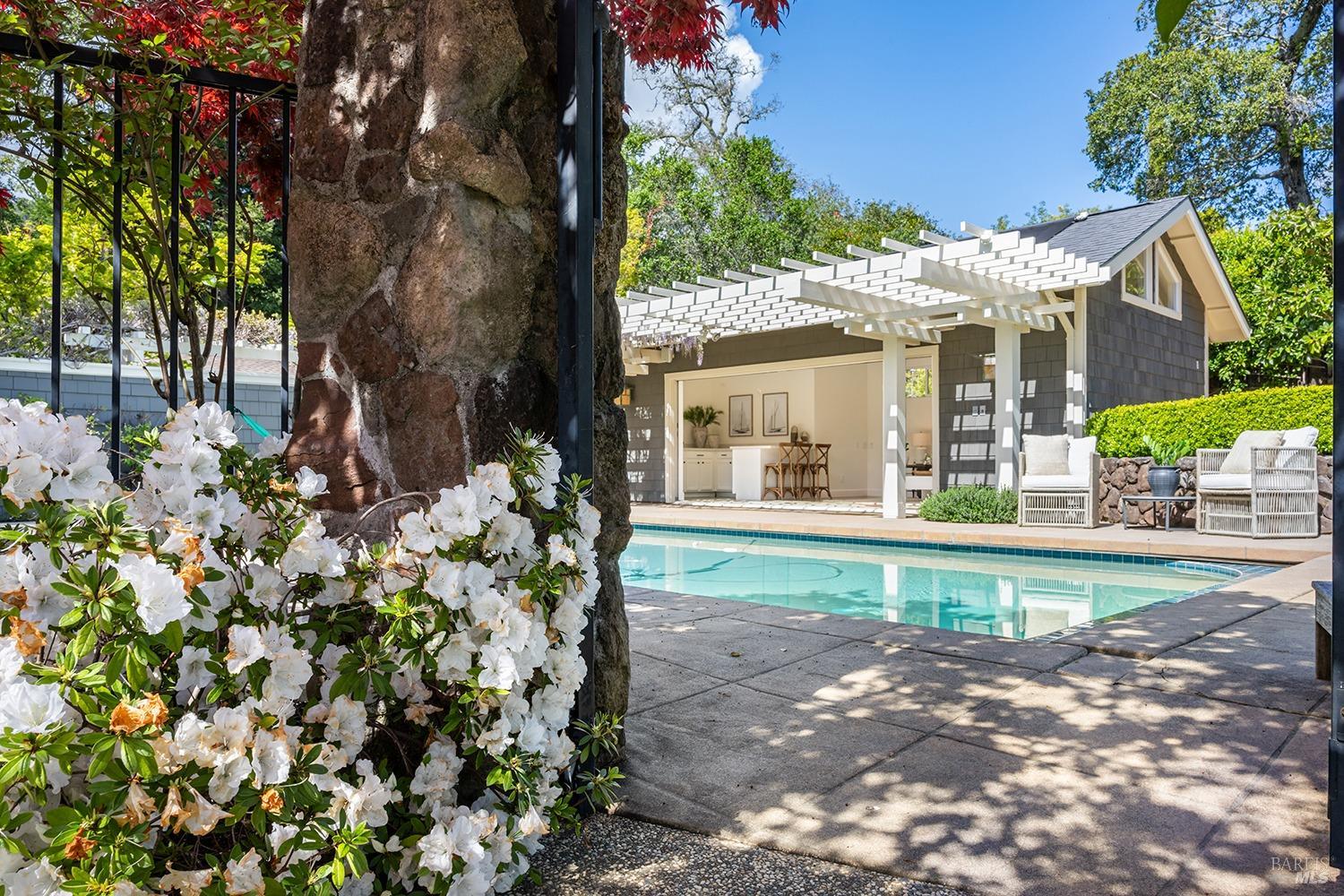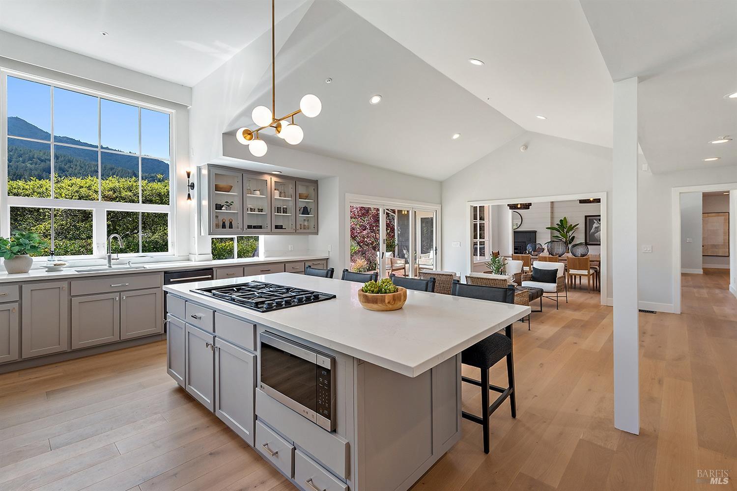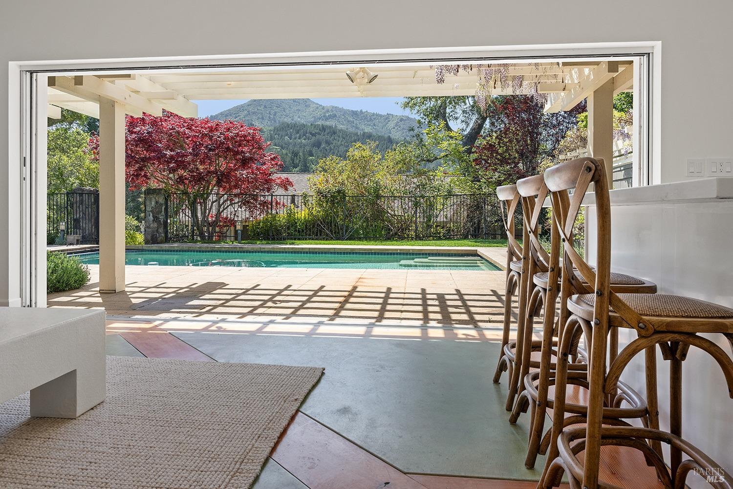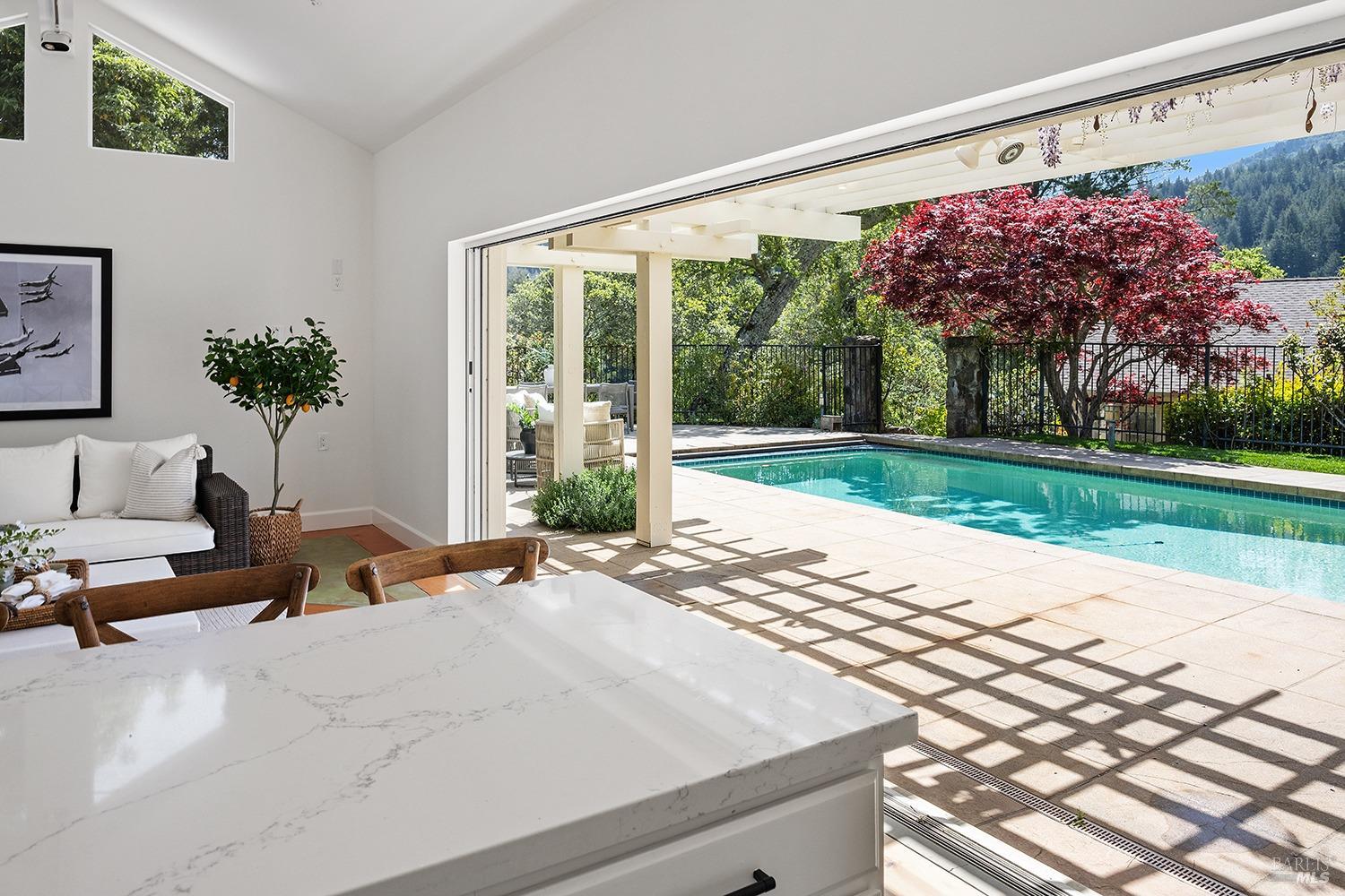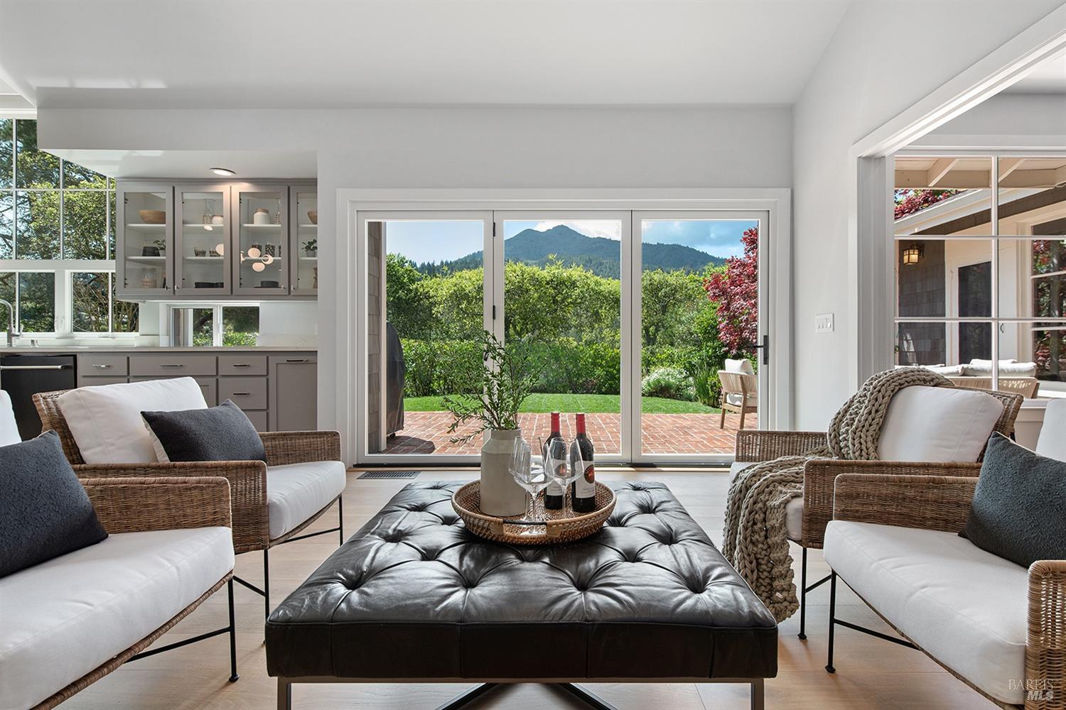 A rare and extraordinary find in lower Kent Woodlands, 8 Live Oak Way is the kind of property that almost never comes available. Set on a private, sun-drenched, 0.66 acre street-to-street lot at the end of a quiet lane, this 5,155 sq. ft. gated compound offers total seclusion, breathtaking scale, and sensational indoor-outdoor flow. The dramatic living room stuns with vaulted, exposed beam ceilings and walls of glass. The kitchen is a showpiece, with a statement island and picture window perfectly framing Mt. Tam. The Main level includes open living spaces, a sun-drenched, expansive primary with direct Mt.Tam views, an additional bedroom, a dedicated office, and laundry room. Downstairs, enjoy a rec room with two ensuite bedrooms and access to the outdoors. Two additional structures elevate the lifestyle: a 315 sq. ft. guest house with kitchenette and bath, and a 390 sq. ft. pool house featuring a full-length multi-slide glass door which opens completely to reveal stunning views of Mt. Tam and the glittering pool beyond, creating a true sanctuary of indoor-outdoor living. Additionally there's a hot tub, level lawn, lush gardens, motor court, EV charging, and A/C. A true Kent Woodlands retreat; private, polished, and unforgettable.