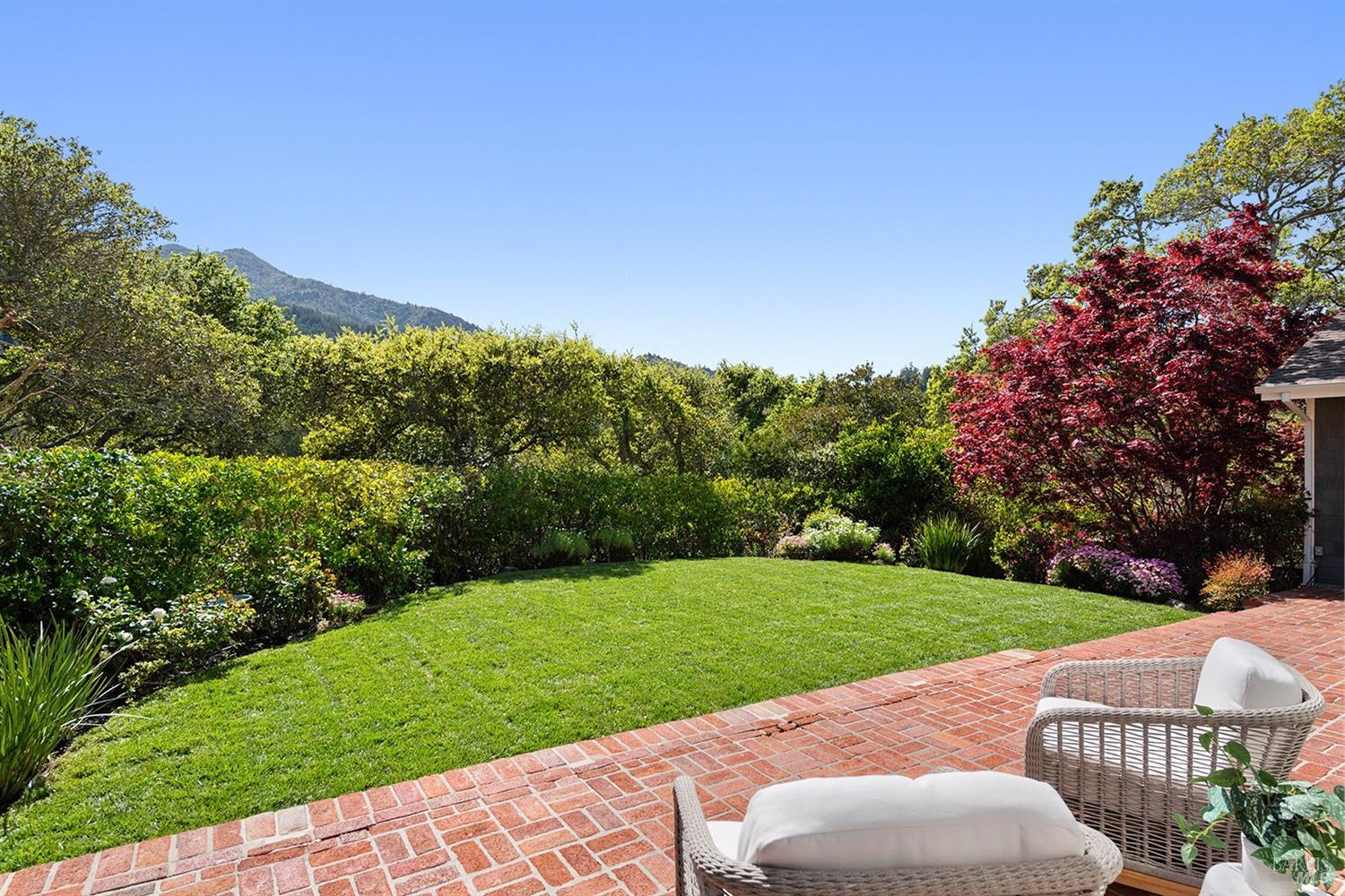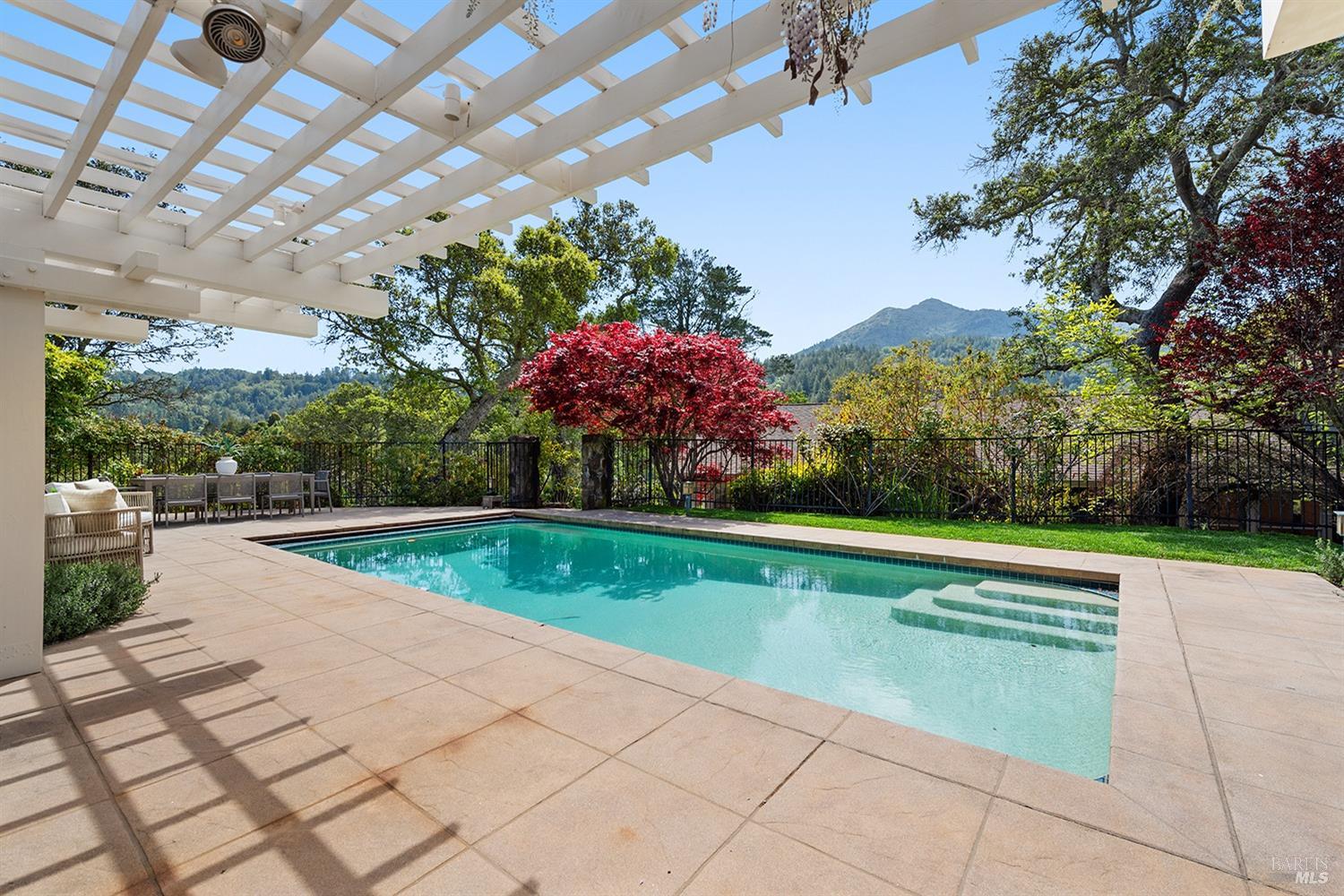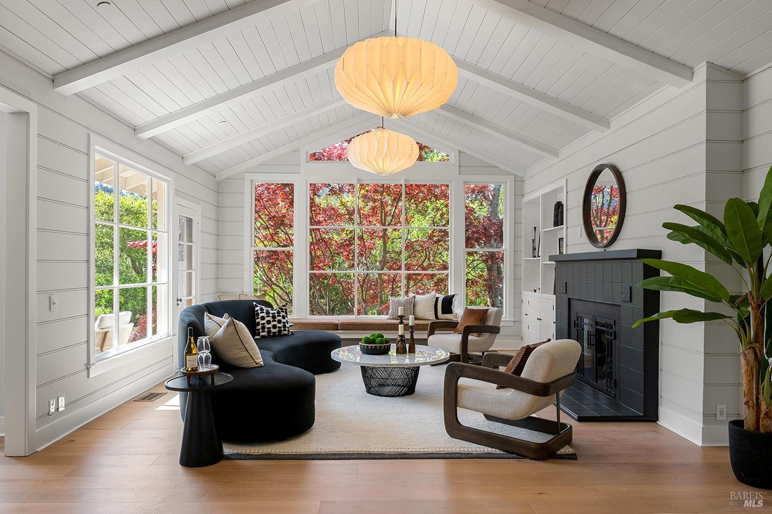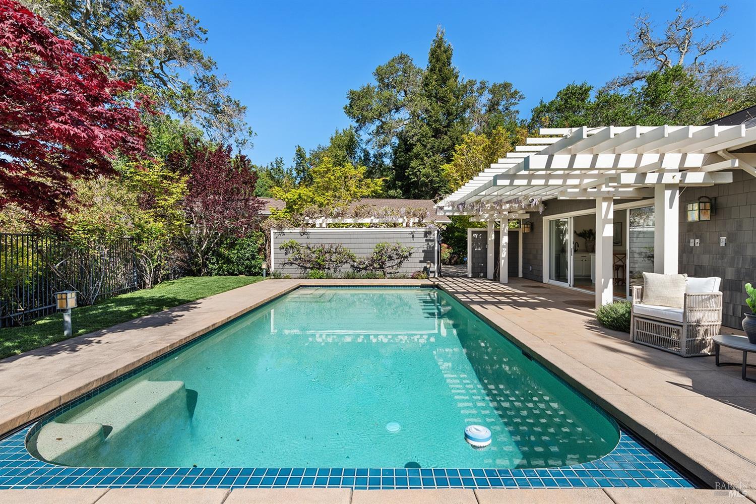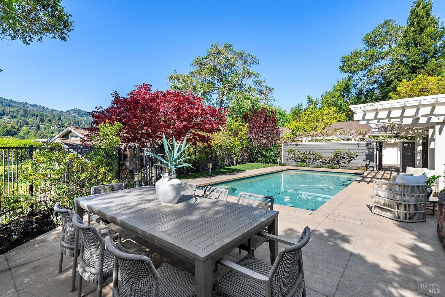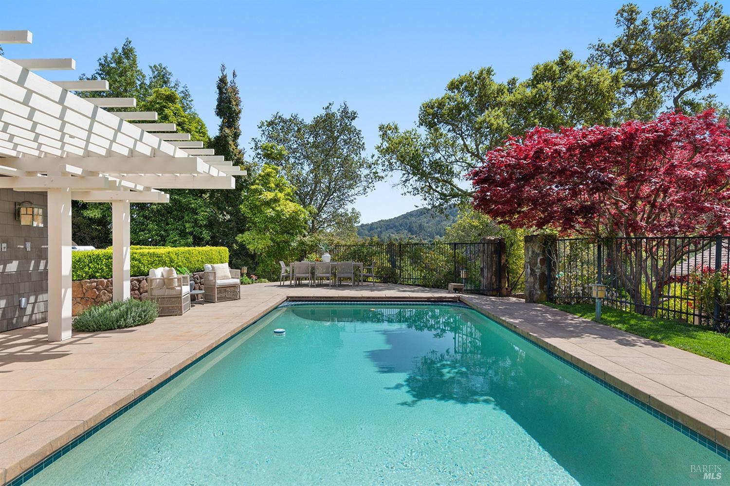 A rare and extraordinary find in lower Kent Woodlands, 8 Live Oak Way is the kind of property that almost never comes available. Set on a private, sun-drenched, 0.66 acre street-to-street lot at the end of a quiet lane, this 5,155 sq. ft. gated compound offers total seclusion, breathtaking scale, and sensational indoor-outdoor flow. The dramatic living room stuns with vaulted, exposed beam ceilings and walls of glass. The kitchen is a showpiece, with a statement island and picture window perfectly framing Mt. Tam. The Main level includes open living spaces, a sun-drenched, expansive primary with direct Mt.Tam views, an additional bedroom, a dedicated office, and laundry room. Downstairs, enjoy a rec room with two ensuite bedrooms and access to the outdoors. Two additional structures elevate the lifestyle: a 315 sq. ft. guest house with kitchenette and bath, and a 390 sq. ft. pool house featuring a full-length multi-slide glass door which opens completely to reveal stunning views of Mt. Tam and the glittering pool beyond, creating a true sanctuary of indoor-outdoor living. Additionally there's a hot tub, level lawn, lush gardens, motor court, EV charging, and A/C. A true Kent Woodlands retreat; private, polished, and unforgettable.