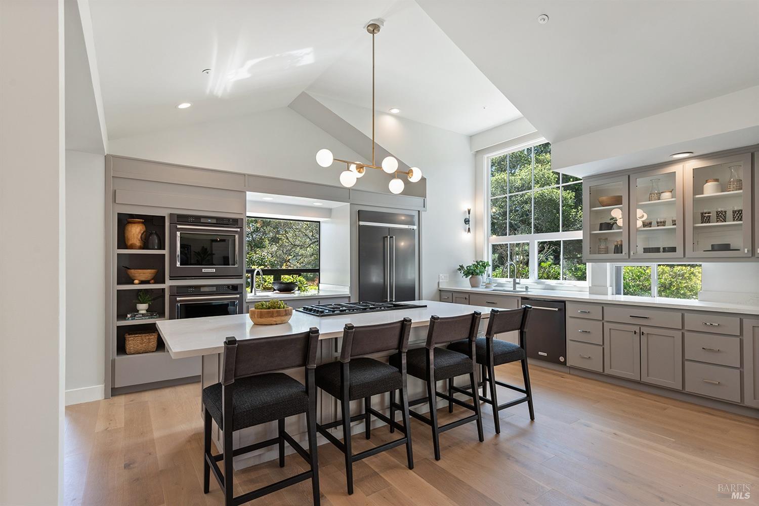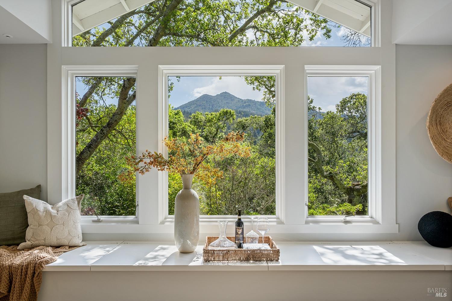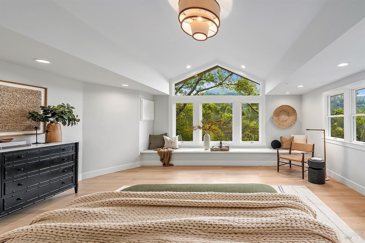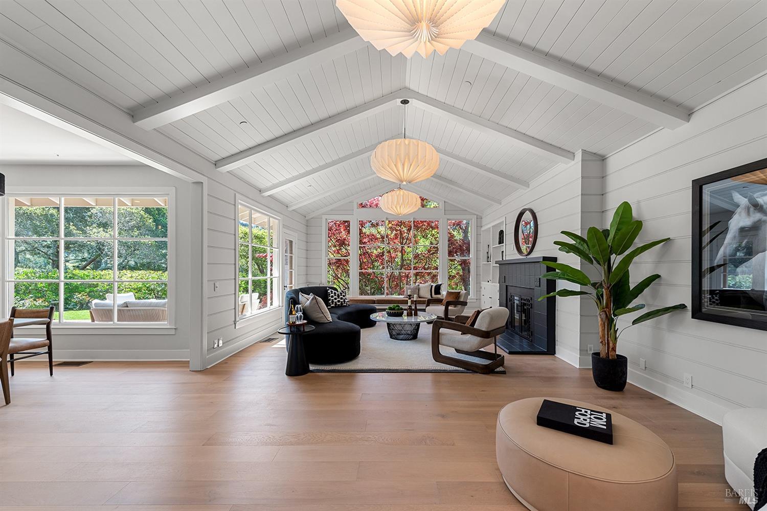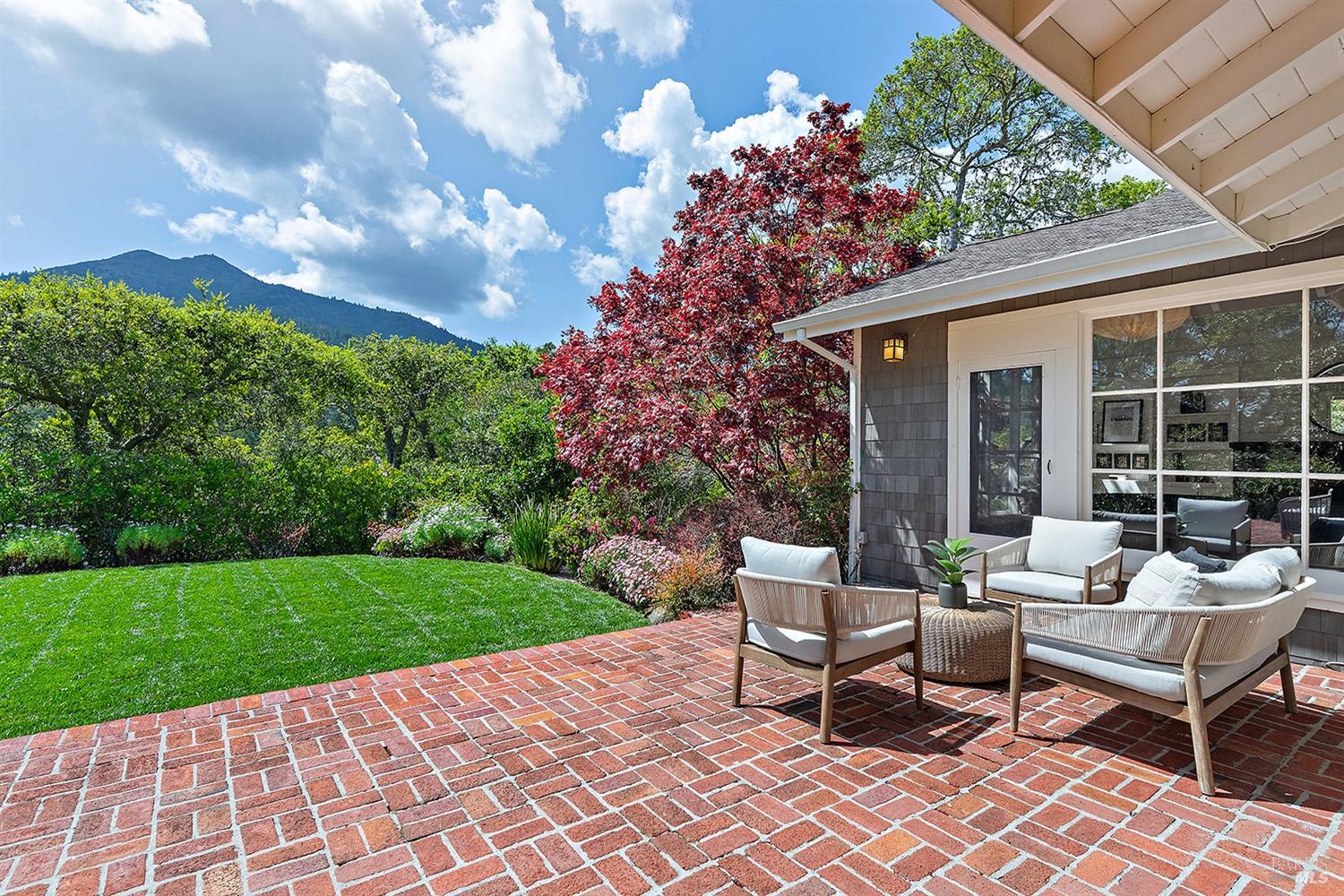 A rare and extraordinary find in lower Kent Woodlands, 8 Live Oak Way is the kind of property that almost never comes available. Set on a private, sun-drenched, 0.66 acre street-to-street lot at the end of a quiet lane, this 5,155 sq. ft. gated compound offers total seclusion, breathtaking scale, and sensational indoor-outdoor flow. The dramatic living room stuns with vaulted, exposed beam ceilings and walls of glass. The kitchen is a showpiece, with a statement island and picture window perfectly framing Mt. Tam. The Main level includes open living spaces, a sun-drenched, expansive primary with direct Mt.Tam views, an additional bedroom, a dedicated office, and laundry room. Downstairs, enjoy a rec room with two ensuite bedrooms and access to the outdoors. Two additional structures elevate the lifestyle: a 315 sq. ft. guest house with kitchenette and bath, and a 390 sq. ft. pool house featuring a full-length multi-slide glass door which opens completely to reveal stunning views of Mt. Tam and the glittering pool beyond, creating a true sanctuary of indoor-outdoor living. Additionally there's a hot tub, level lawn, lush gardens, motor court, EV charging, and A/C. A true Kent Woodlands retreat; private, polished, and unforgettable.