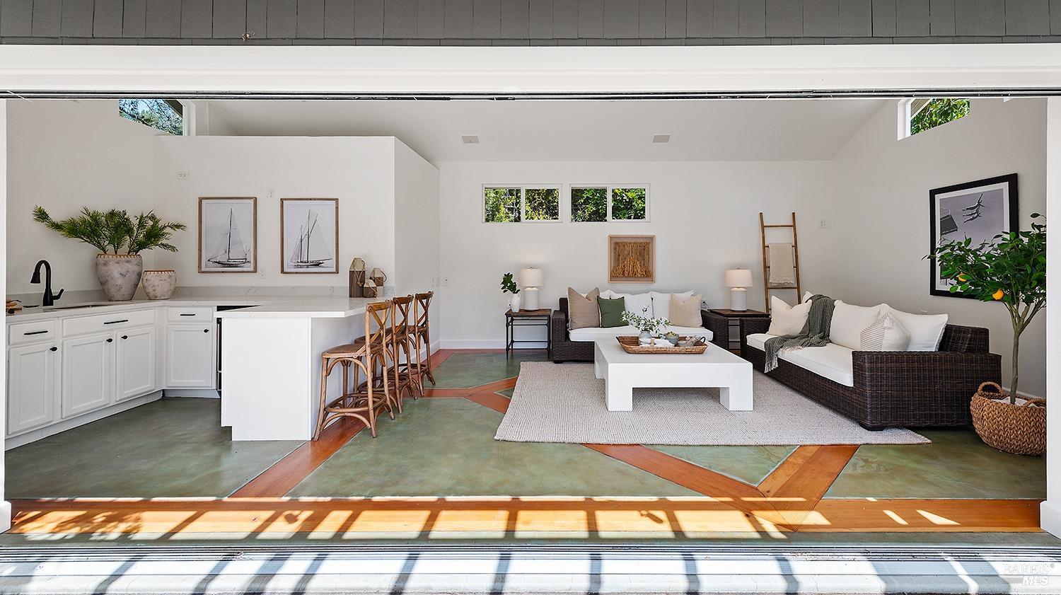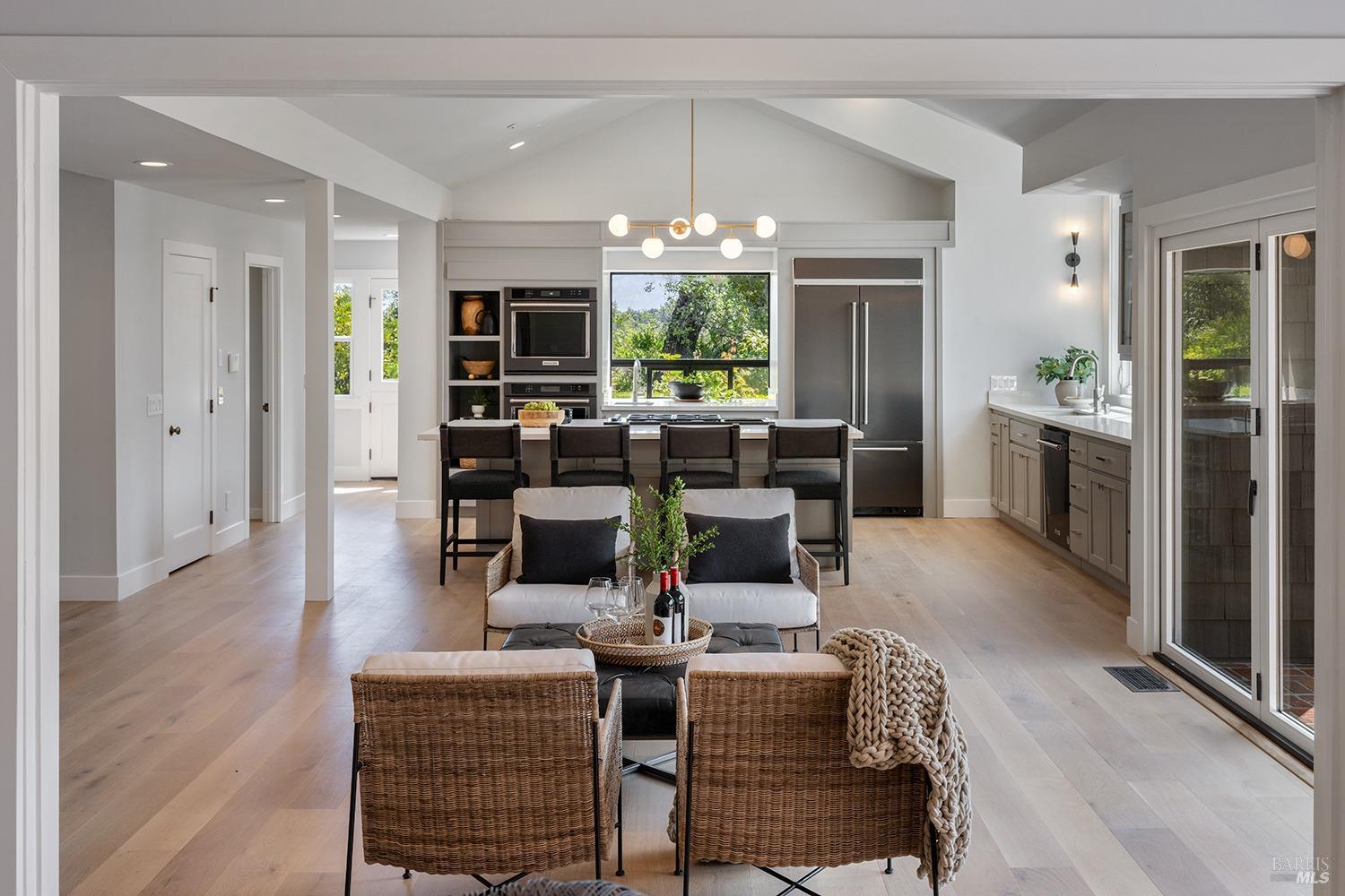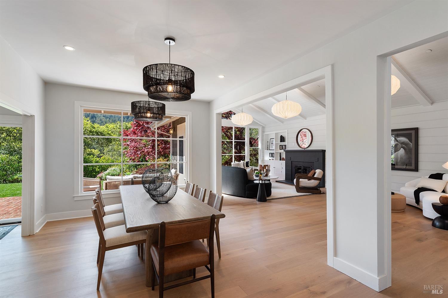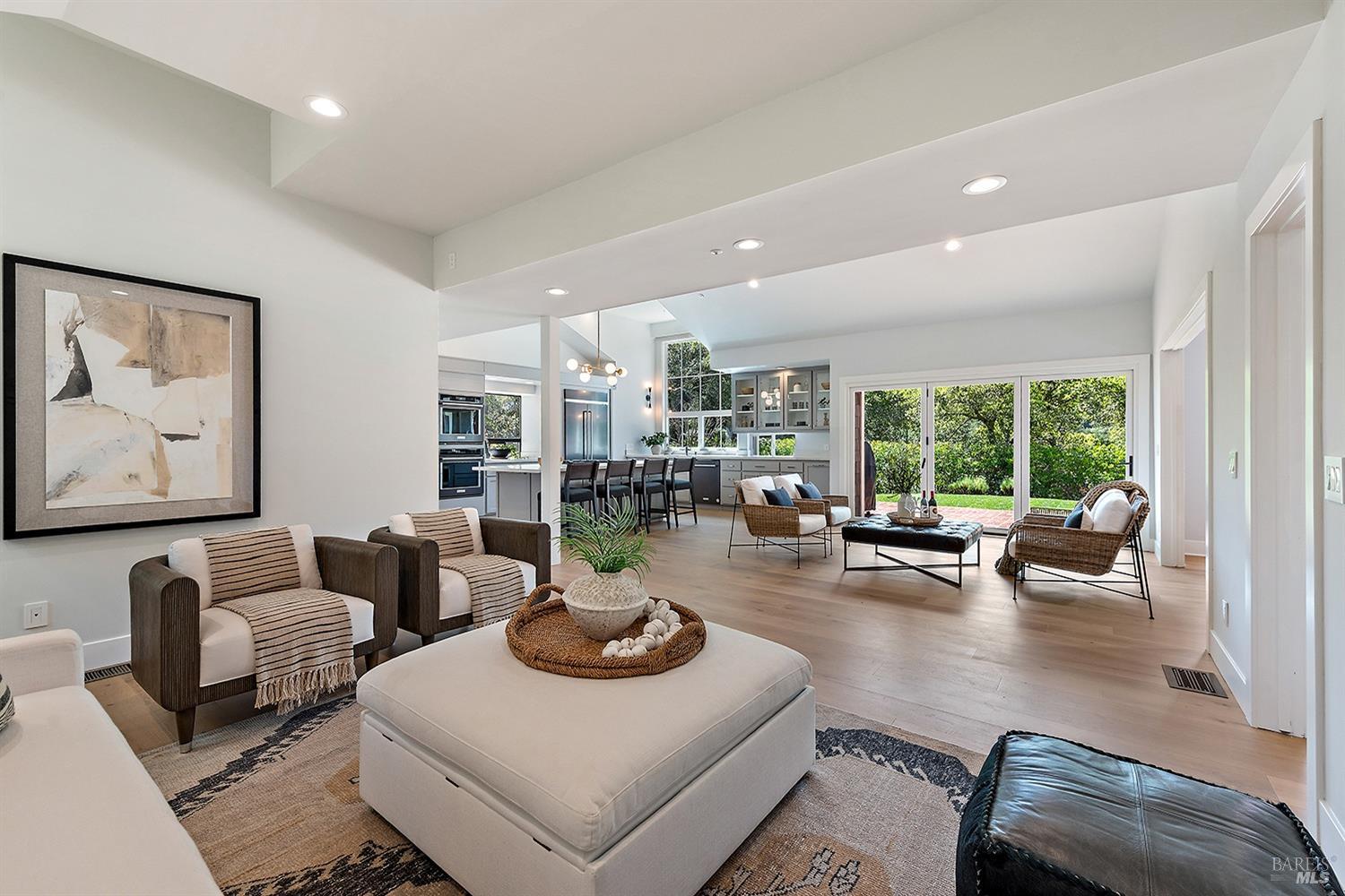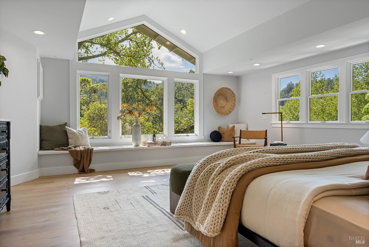 A rare and extraordinary find in lower Kent Woodlands, 8 Live Oak Way is the kind of property that almost never comes available. Set on a private, sun-drenched, 0.66 acre street-to-street lot at the end of a quiet lane, this 5,155 sq. ft. gated compound offers total seclusion, breathtaking scale, and sensational indoor-outdoor flow. The dramatic living room stuns with vaulted, exposed beam ceilings and walls of glass. The kitchen is a showpiece, with a statement island and picture window perfectly framing Mt. Tam. The Main level includes open living spaces, a sun-drenched, expansive primary with direct Mt.Tam views, an additional bedroom, a dedicated office, and laundry room. Downstairs, enjoy a rec room with two ensuite bedrooms and access to the outdoors. Two additional structures elevate the lifestyle: a 315 sq. ft. guest house with kitchenette and bath, and a 390 sq. ft. pool house featuring a full-length multi-slide glass door which opens completely to reveal stunning views of Mt. Tam and the glittering pool beyond, creating a true sanctuary of indoor-outdoor living. Additionally there's a hot tub, level lawn, lush gardens, motor court, EV charging, and A/C. A true Kent Woodlands retreat; private, polished, and unforgettable.