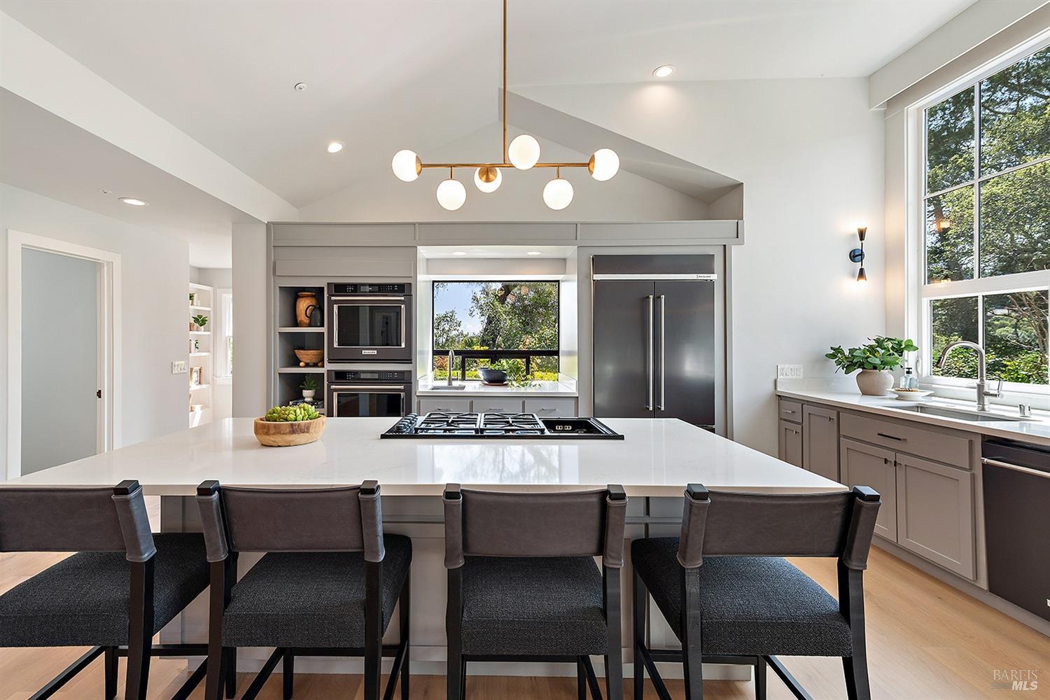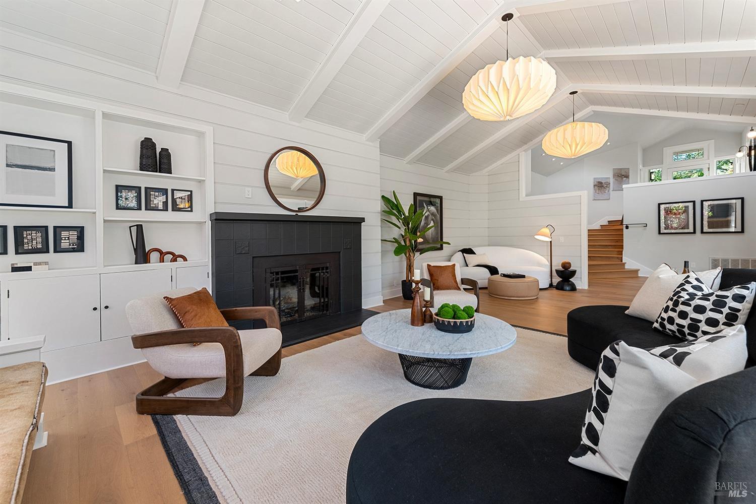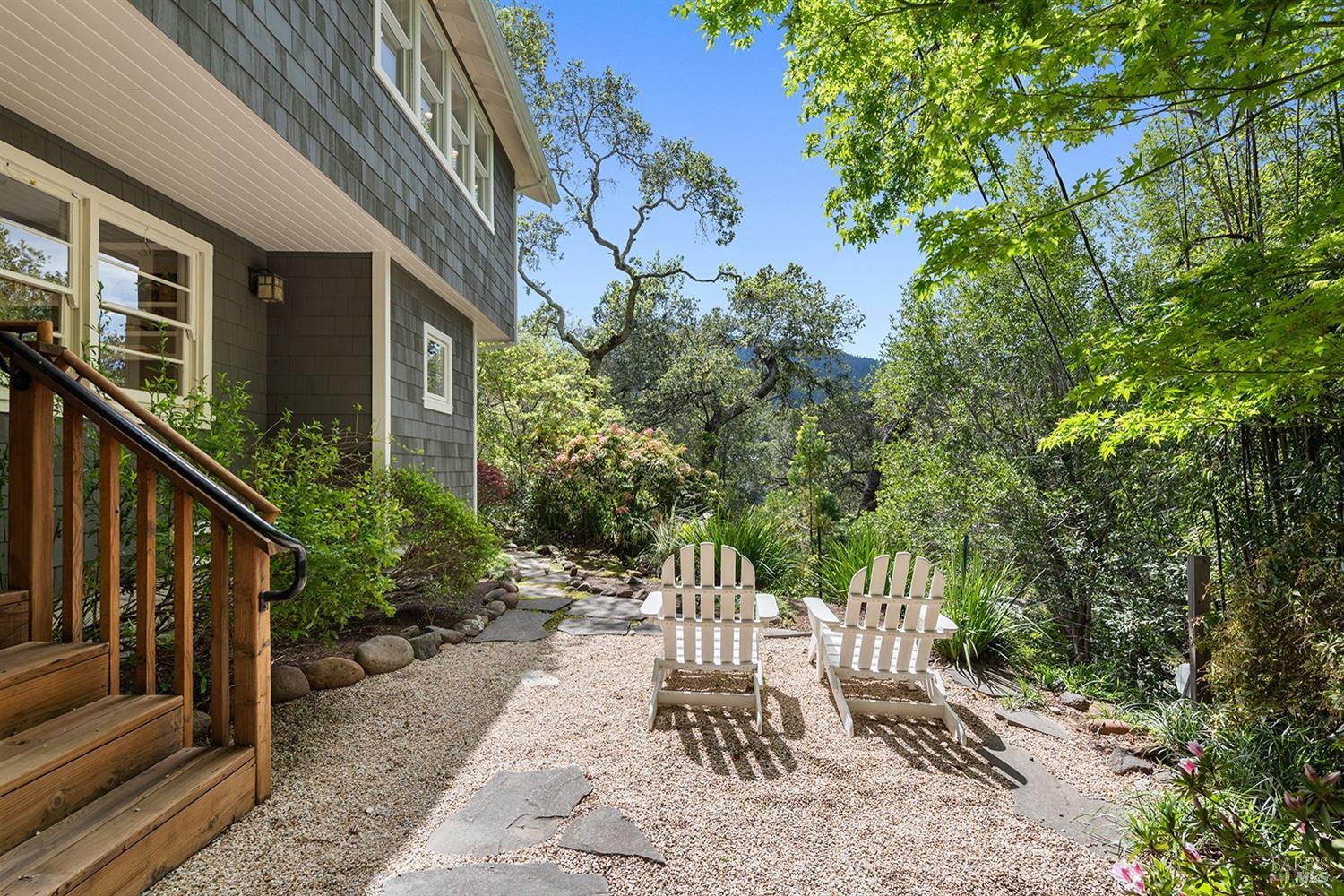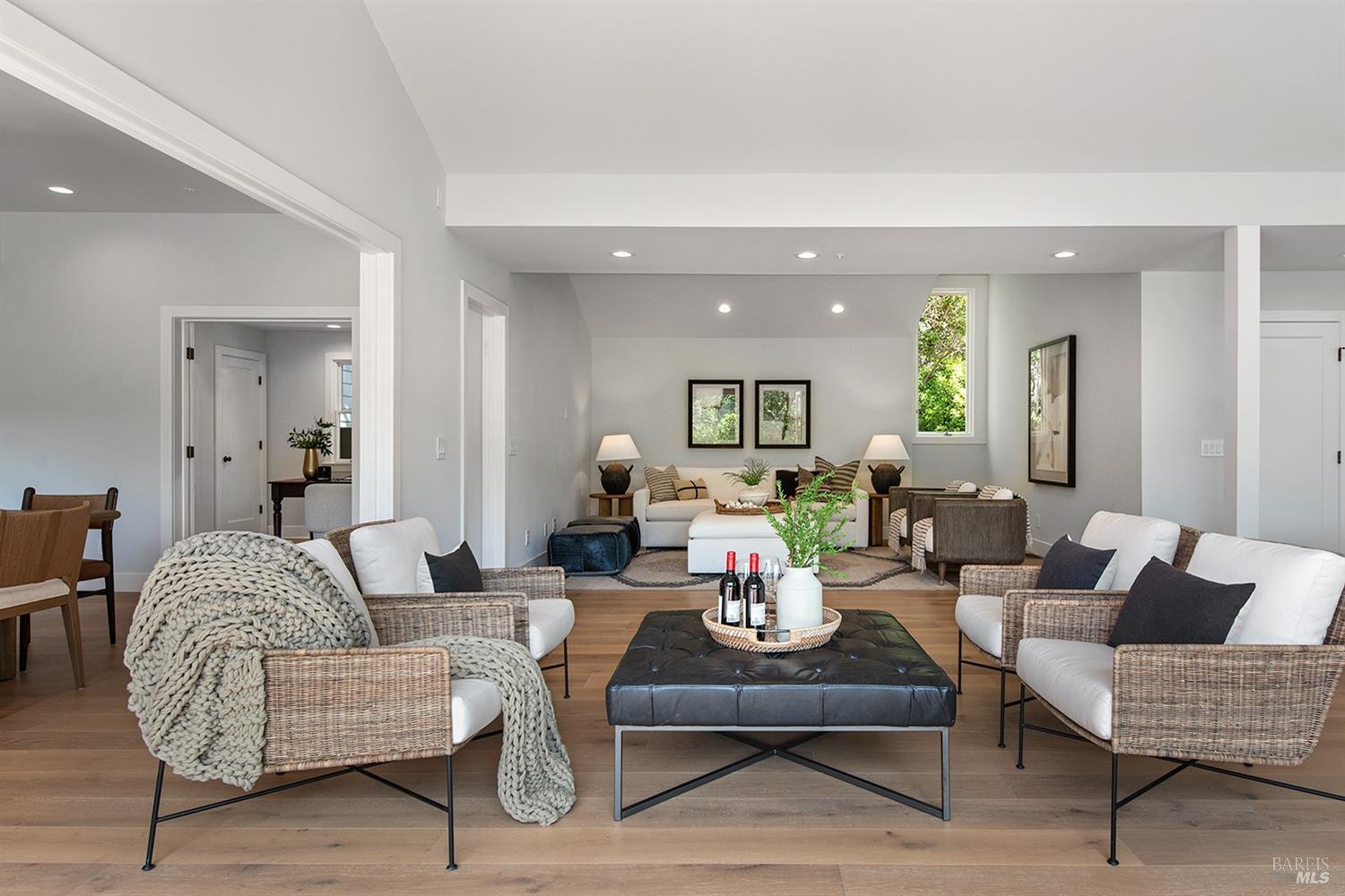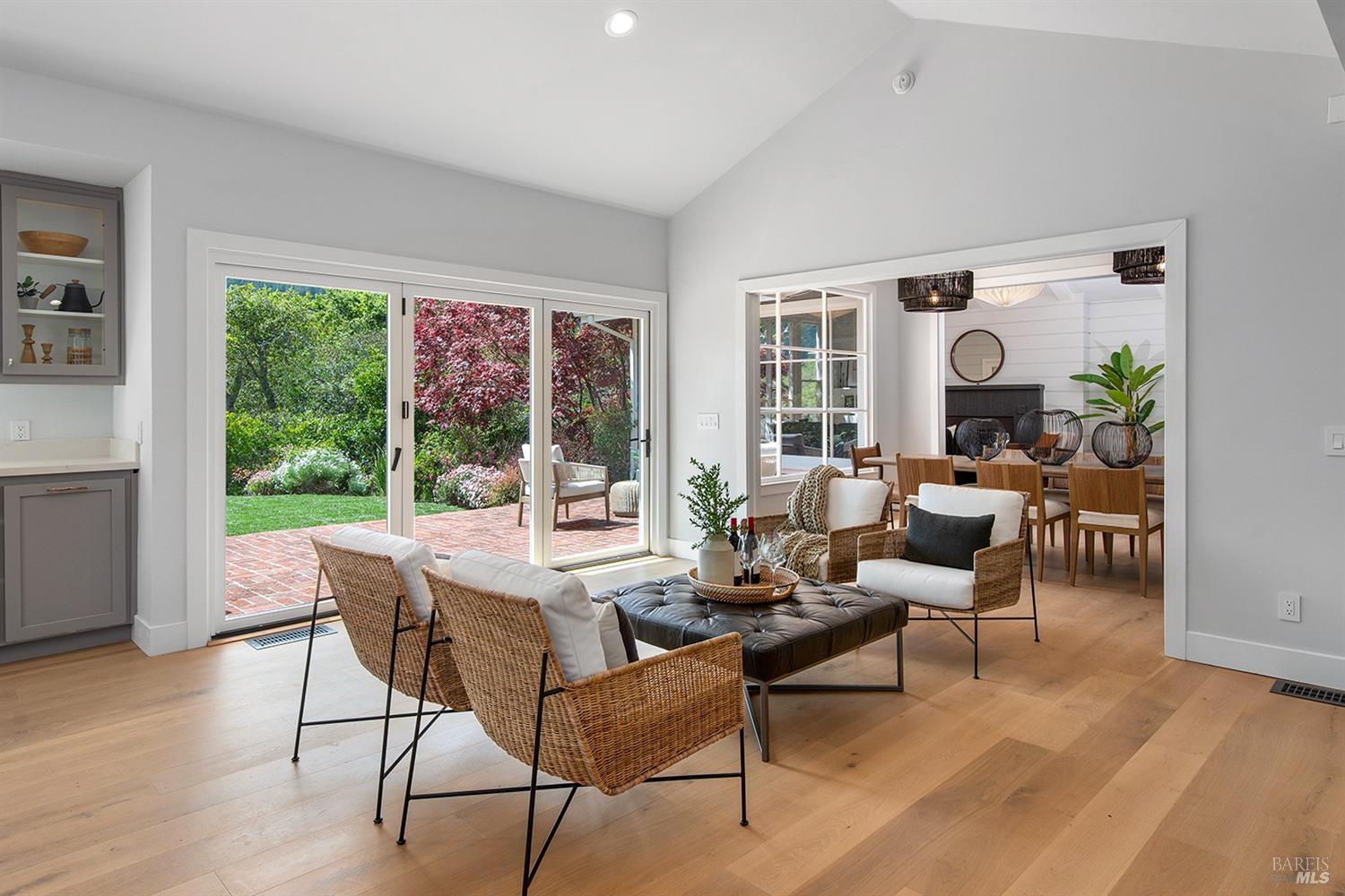 A rare and extraordinary find in lower Kent Woodlands, 8 Live Oak Way is the kind of property that almost never comes available. Set on a private, sun-drenched, 0.66 acre street-to-street lot at the end of a quiet lane, this 5,155 sq. ft. gated compound offers total seclusion, breathtaking scale, and sensational indoor-outdoor flow. The dramatic living room stuns with vaulted, exposed beam ceilings and walls of glass. The kitchen is a showpiece, with a statement island and picture window perfectly framing Mt. Tam. The Main level includes open living spaces, a sun-drenched, expansive primary with direct Mt.Tam views, an additional bedroom, a dedicated office, and laundry room. Downstairs, enjoy a rec room with two ensuite bedrooms and access to the outdoors. Two additional structures elevate the lifestyle: a 315 sq. ft. guest house with kitchenette and bath, and a 390 sq. ft. pool house featuring a full-length multi-slide glass door which opens completely to reveal stunning views of Mt. Tam and the glittering pool beyond, creating a true sanctuary of indoor-outdoor living. Additionally there's a hot tub, level lawn, lush gardens, motor court, EV charging, and A/C. A true Kent Woodlands retreat; private, polished, and unforgettable.