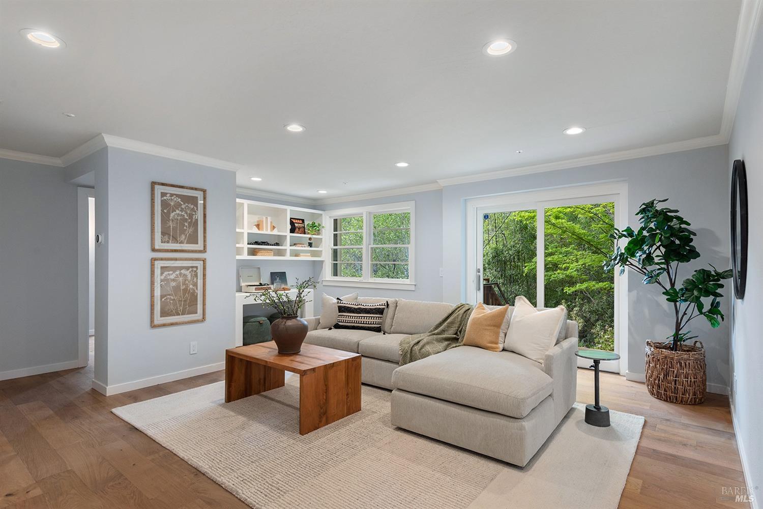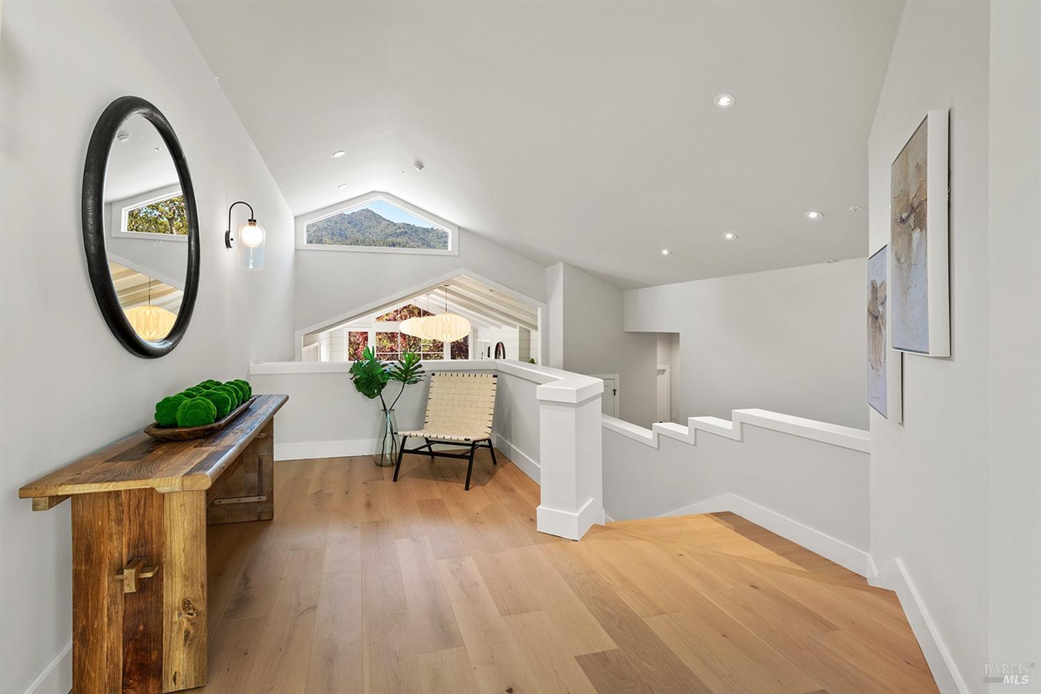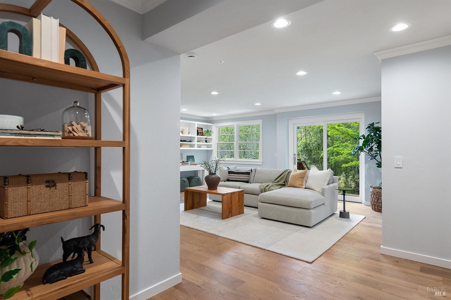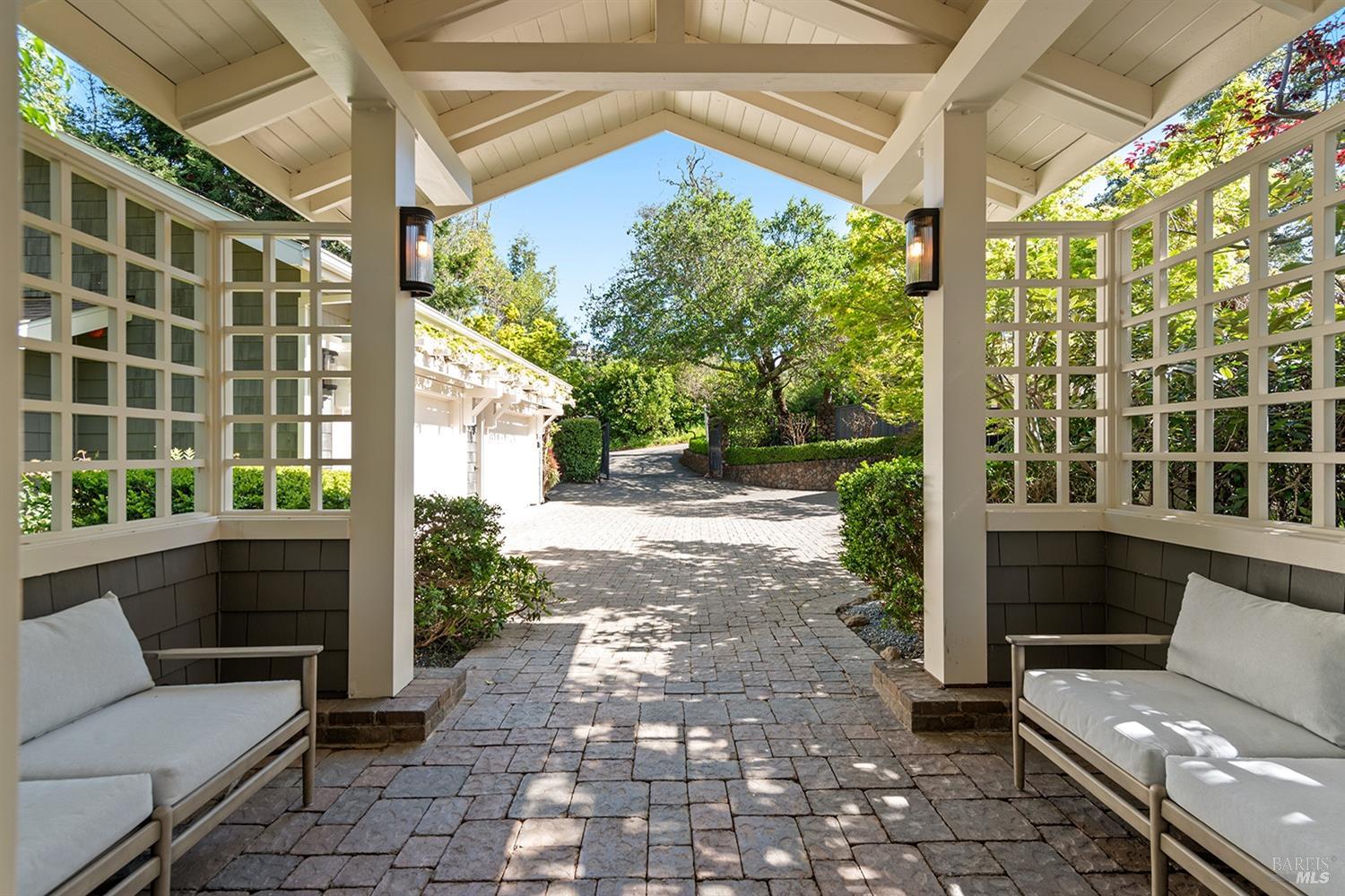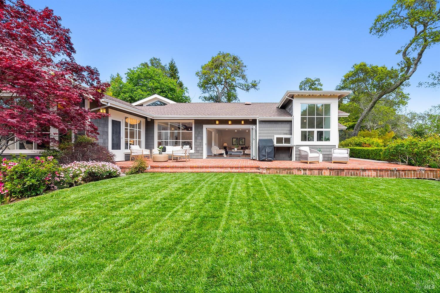 A rare and extraordinary find in lower Kent Woodlands, 8 Live Oak Way is the kind of property that almost never comes available. Set on a private, sun-drenched, 0.66 acre street-to-street lot at the end of a quiet lane, this 5,155 sq. ft. gated compound offers total seclusion, breathtaking scale, and sensational indoor-outdoor flow. The dramatic living room stuns with vaulted, exposed beam ceilings and walls of glass. The kitchen is a showpiece, with a statement island and picture window perfectly framing Mt. Tam. The Main level includes open living spaces, a sun-drenched, expansive primary with direct Mt.Tam views, an additional bedroom, a dedicated office, and laundry room. Downstairs, enjoy a rec room with two ensuite bedrooms and access to the outdoors. Two additional structures elevate the lifestyle: a 315 sq. ft. guest house with kitchenette and bath, and a 390 sq. ft. pool house featuring a full-length multi-slide glass door which opens completely to reveal stunning views of Mt. Tam and the glittering pool beyond, creating a true sanctuary of indoor-outdoor living. Additionally there's a hot tub, level lawn, lush gardens, motor court, EV charging, and A/C. A true Kent Woodlands retreat; private, polished, and unforgettable.