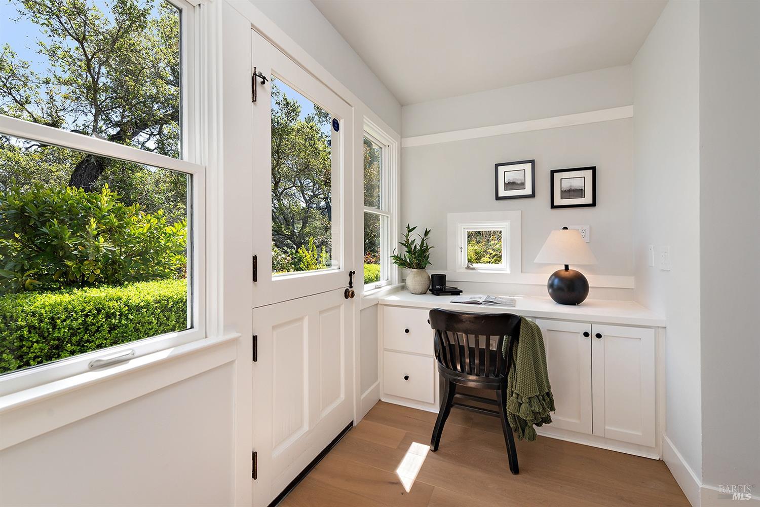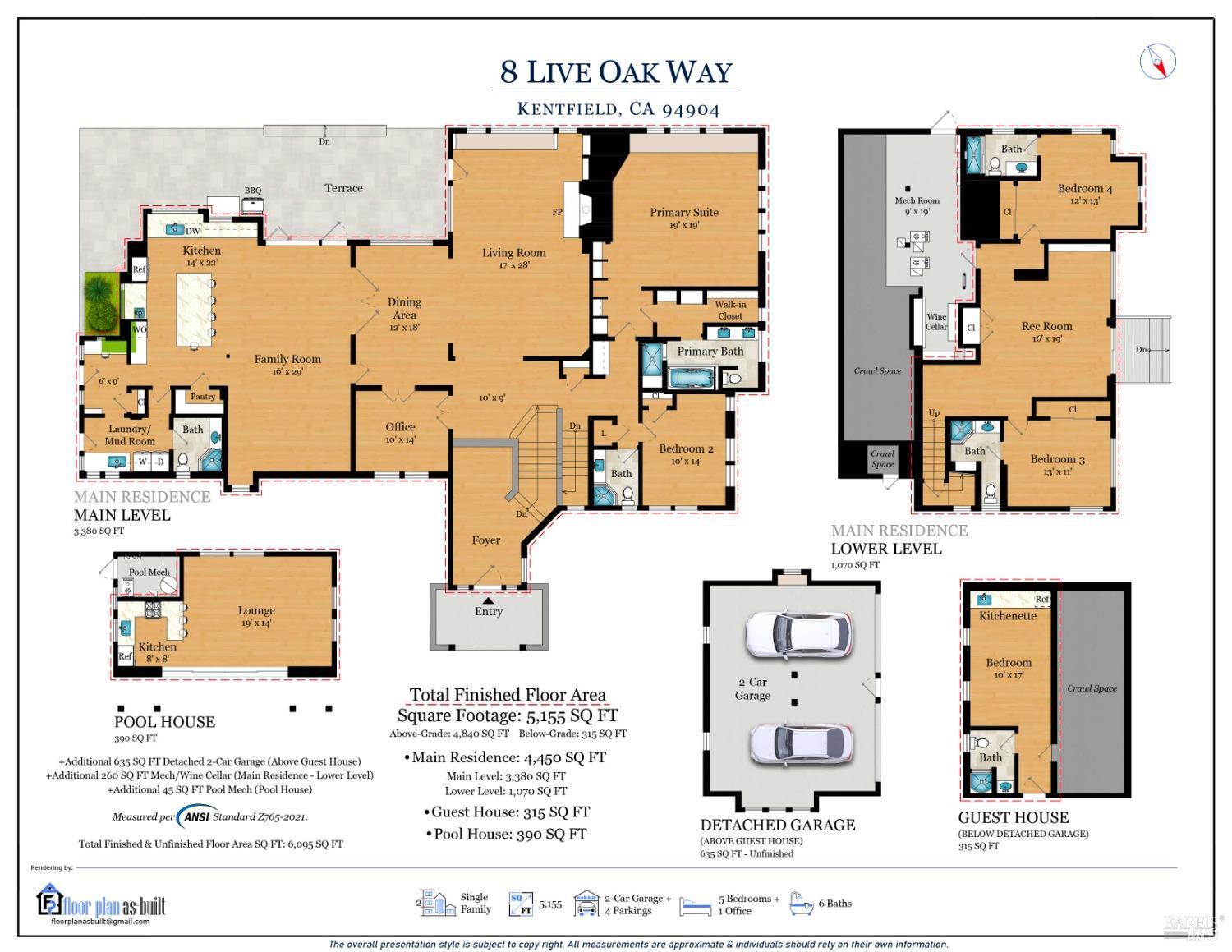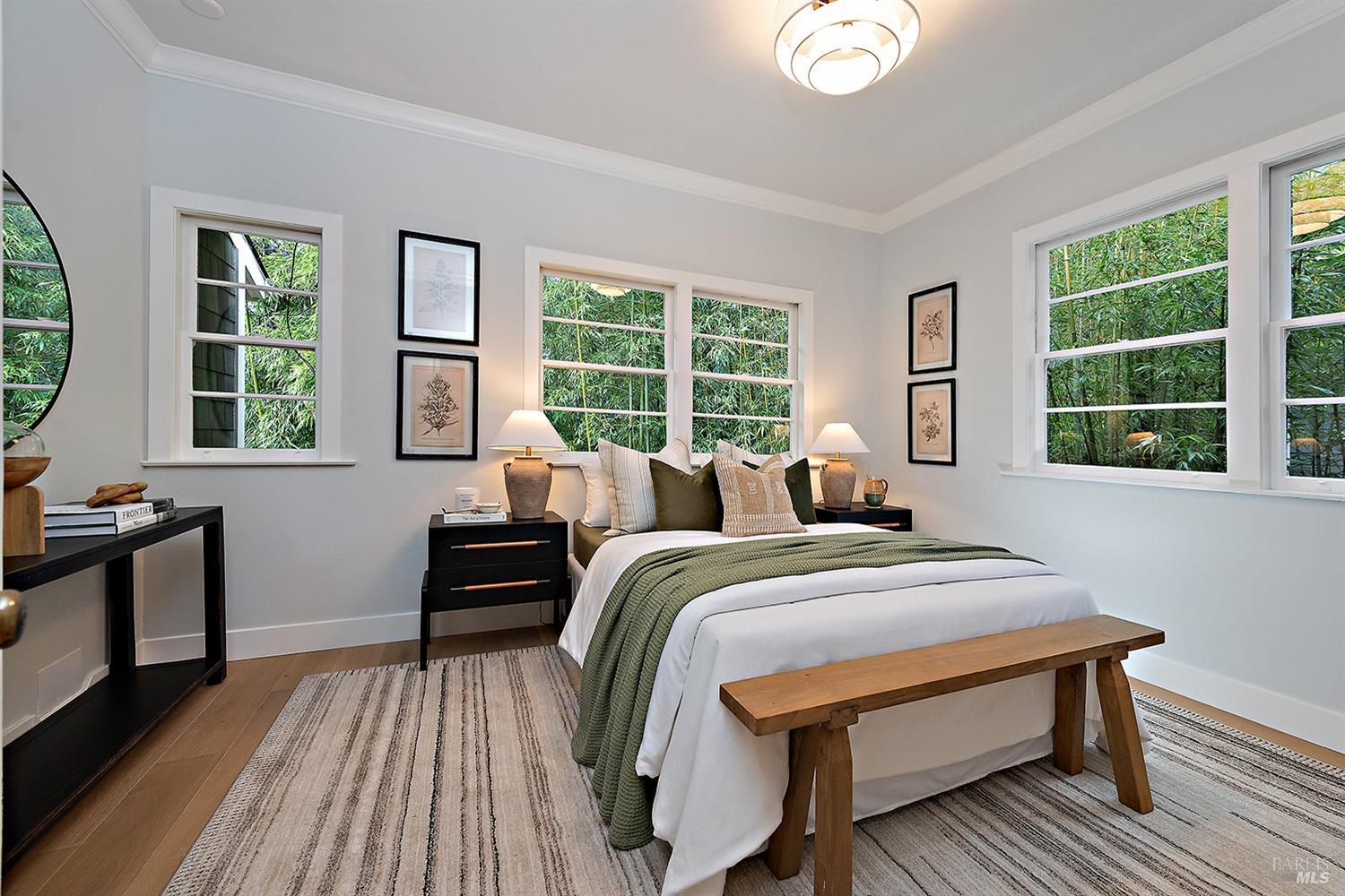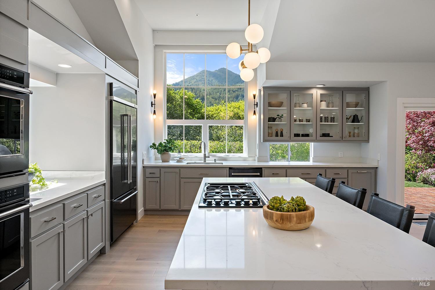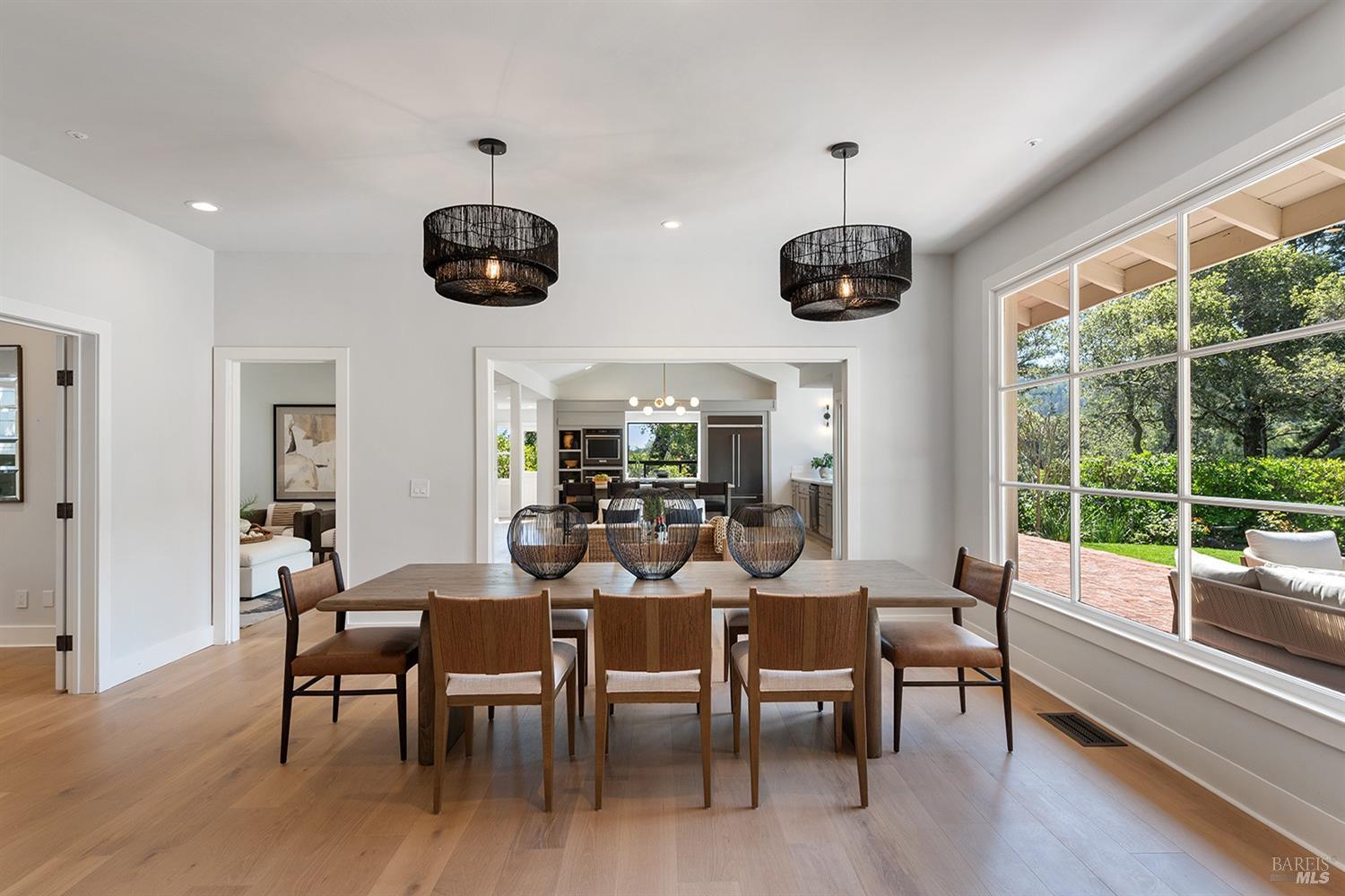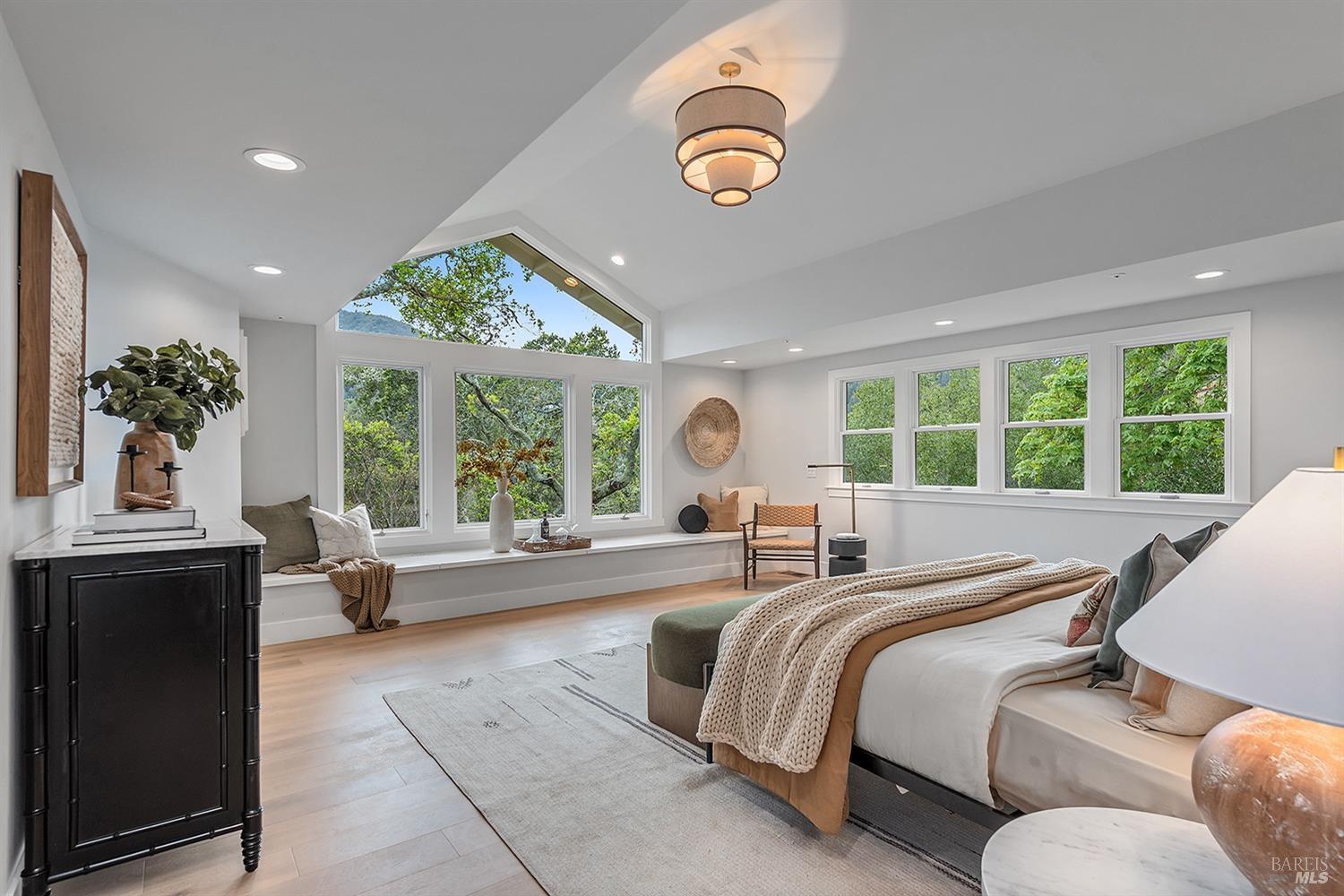 A rare and extraordinary find in lower Kent Woodlands, 8 Live Oak Way is the kind of property that almost never comes available. Set on a private, sun-drenched, 0.66 acre street-to-street lot at the end of a quiet lane, this 5,155 sq. ft. gated compound offers total seclusion, breathtaking scale, and sensational indoor-outdoor flow. The dramatic living room stuns with vaulted, exposed beam ceilings and walls of glass. The kitchen is a showpiece, with a statement island and picture window perfectly framing Mt. Tam. The Main level includes open living spaces, a sun-drenched, expansive primary with direct Mt.Tam views, an additional bedroom, a dedicated office, and laundry room. Downstairs, enjoy a rec room with two ensuite bedrooms and access to the outdoors. Two additional structures elevate the lifestyle: a 315 sq. ft. guest house with kitchenette and bath, and a 390 sq. ft. pool house featuring a full-length multi-slide glass door which opens completely to reveal stunning views of Mt. Tam and the glittering pool beyond, creating a true sanctuary of indoor-outdoor living. Additionally there's a hot tub, level lawn, lush gardens, motor court, EV charging, and A/C. A true Kent Woodlands retreat; private, polished, and unforgettable.
