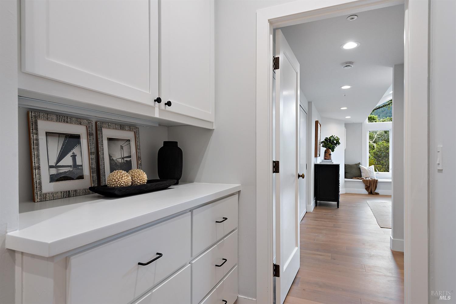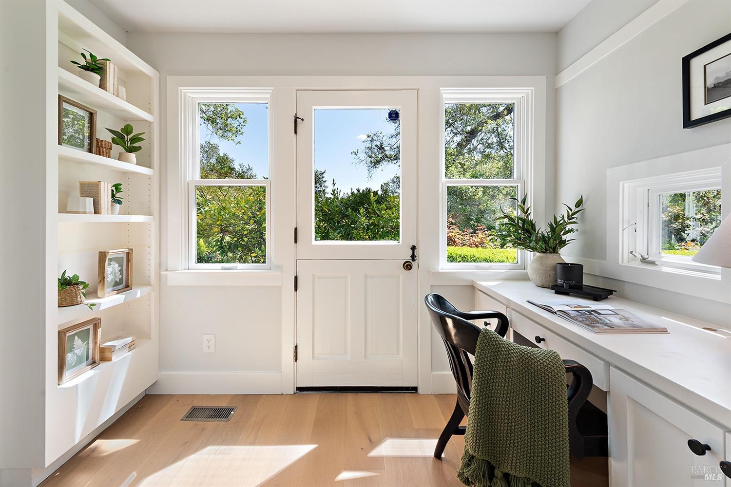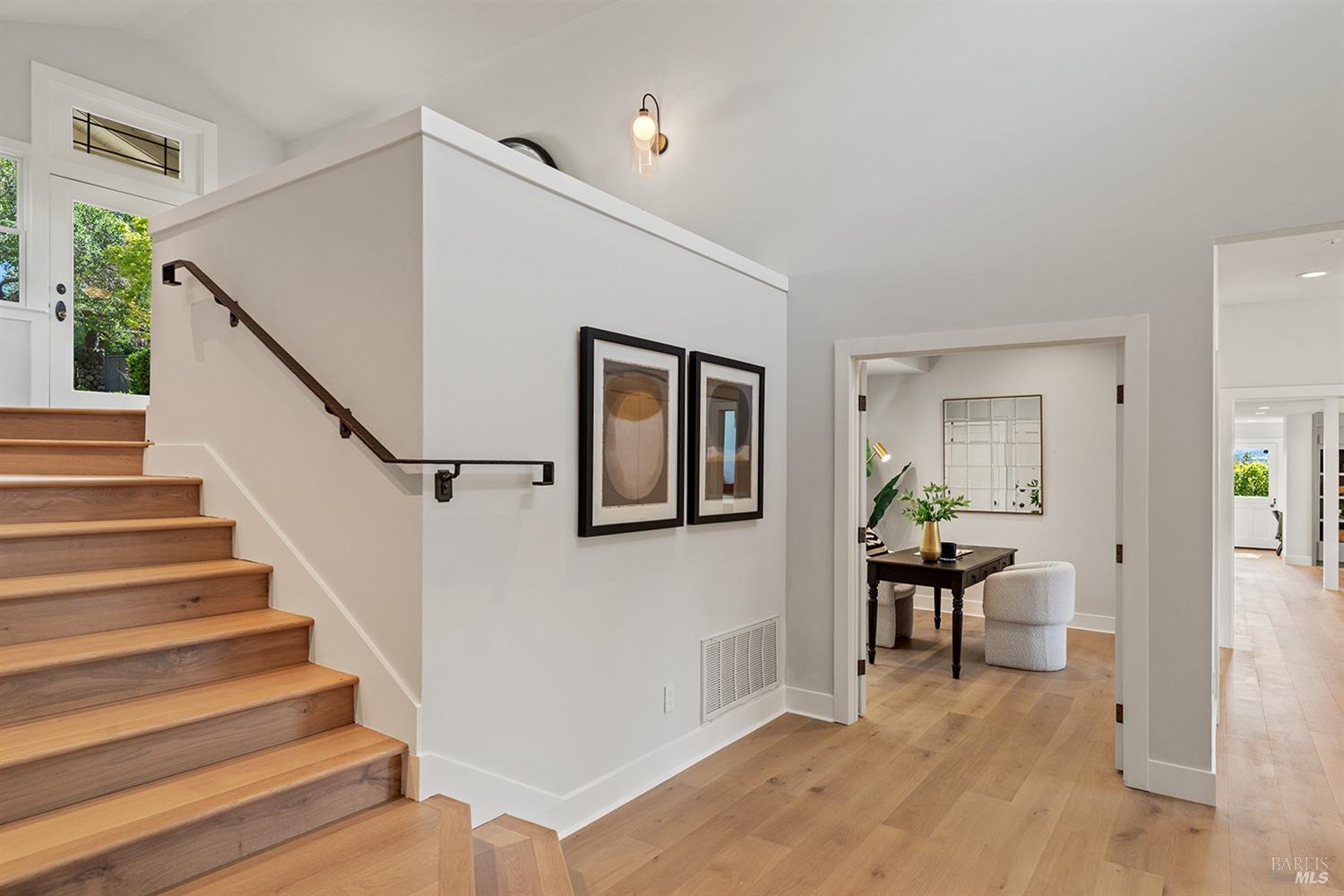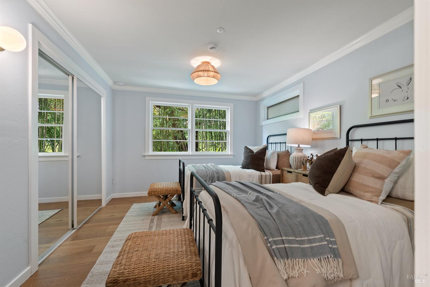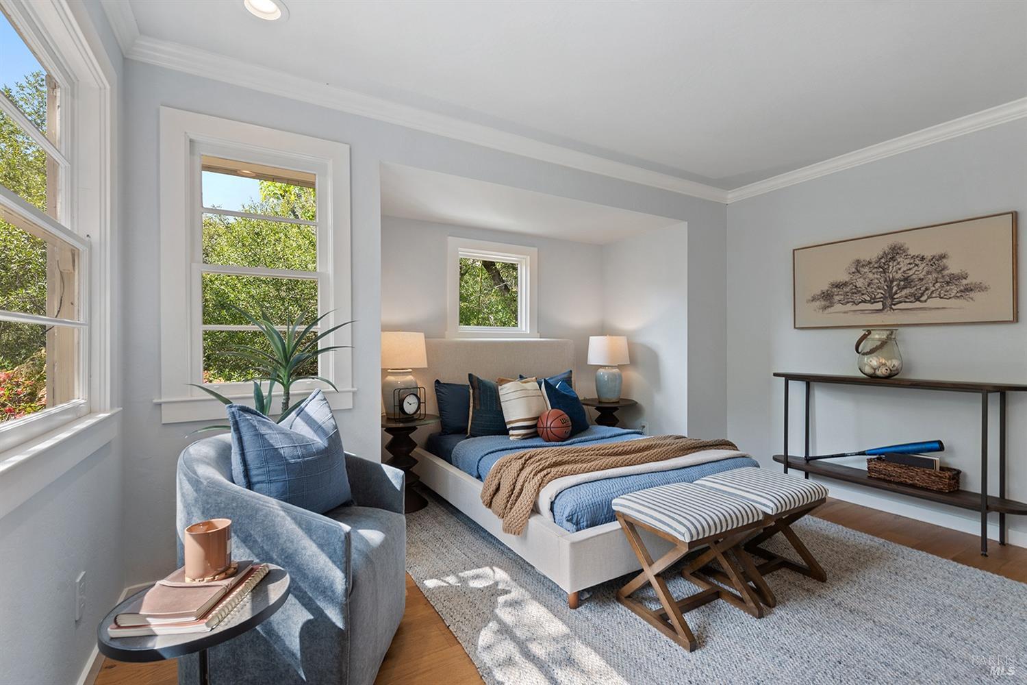 A rare and extraordinary find in lower Kent Woodlands, 8 Live Oak Way is the kind of property that almost never comes available. Set on a private, sun-drenched, 0.66 acre street-to-street lot at the end of a quiet lane, this 5,155 sq. ft. gated compound offers total seclusion, breathtaking scale, and sensational indoor-outdoor flow. The dramatic living room stuns with vaulted, exposed beam ceilings and walls of glass. The kitchen is a showpiece, with a statement island and picture window perfectly framing Mt. Tam. The Main level includes open living spaces, a sun-drenched, expansive primary with direct Mt.Tam views, an additional bedroom, a dedicated office, and laundry room. Downstairs, enjoy a rec room with two ensuite bedrooms and access to the outdoors. Two additional structures elevate the lifestyle: a 315 sq. ft. guest house with kitchenette and bath, and a 390 sq. ft. pool house featuring a full-length multi-slide glass door which opens completely to reveal stunning views of Mt. Tam and the glittering pool beyond, creating a true sanctuary of indoor-outdoor living. Additionally there's a hot tub, level lawn, lush gardens, motor court, EV charging, and A/C. A true Kent Woodlands retreat; private, polished, and unforgettable.
